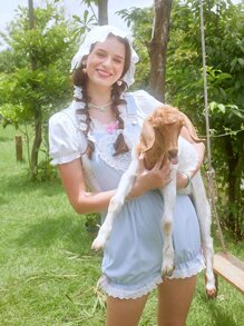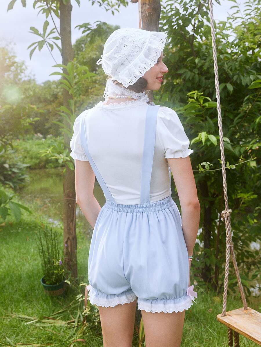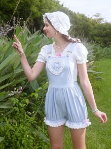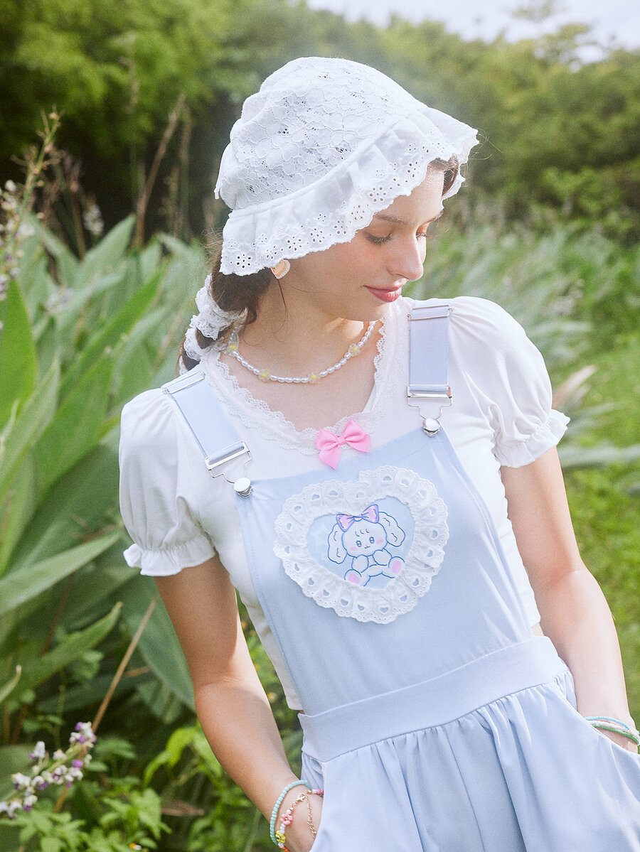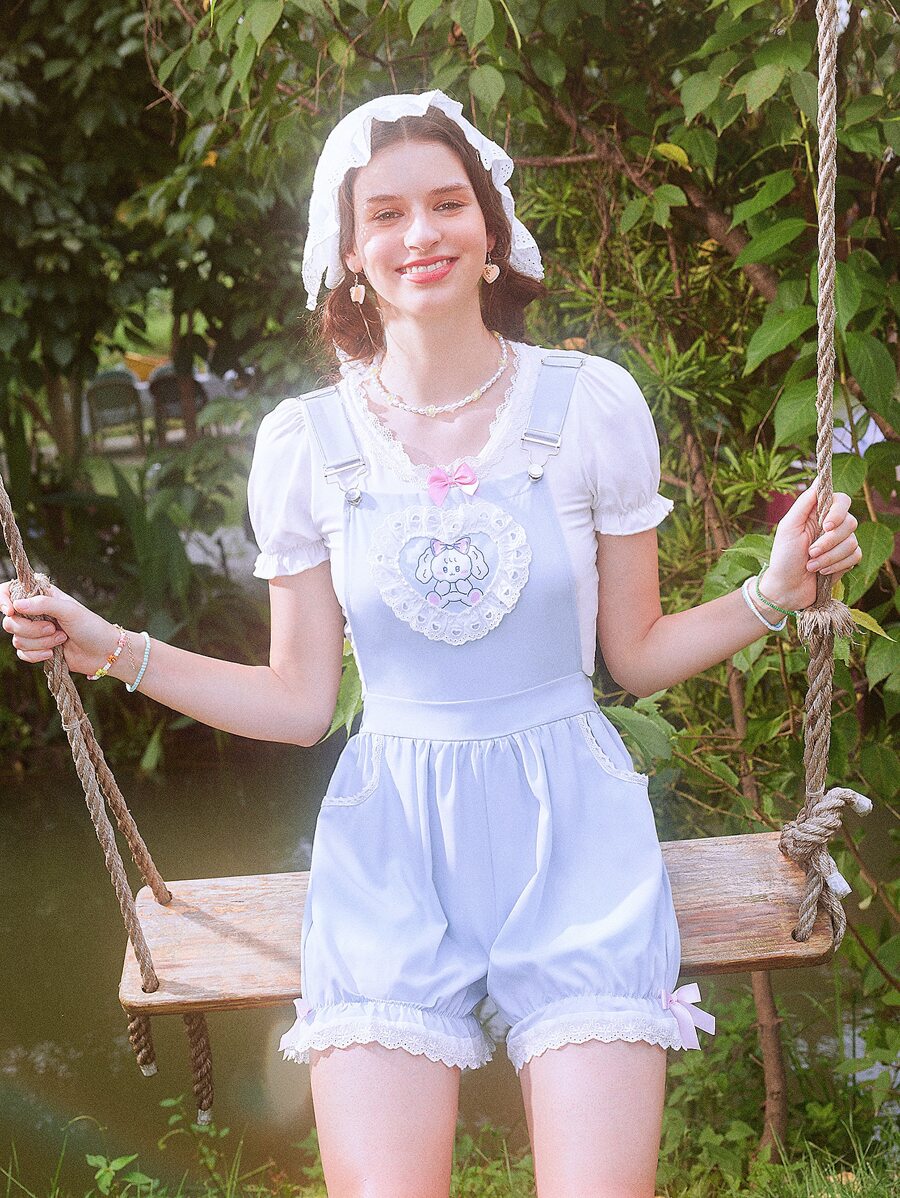 Kawaii Cartoon Graphic Eyelet Embroidery Overall Romper