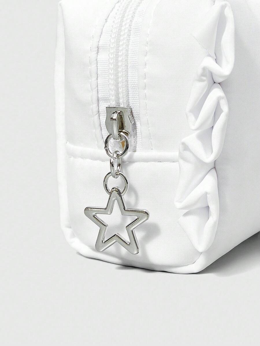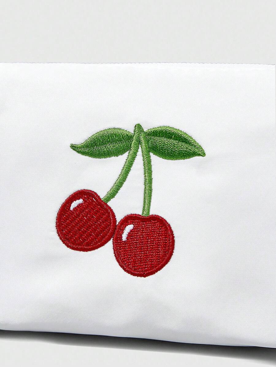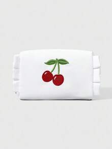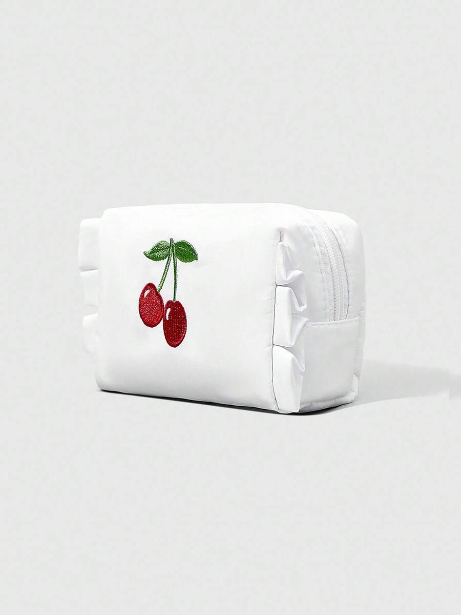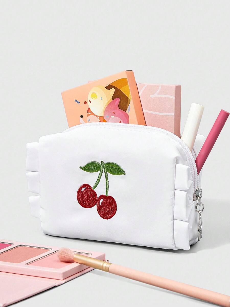 Kawaii Cherry Embroidery Cute Ruffle Trim Portable Cosmetic Bag