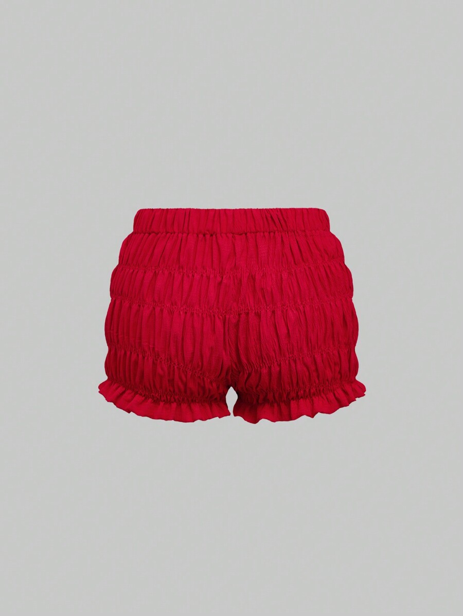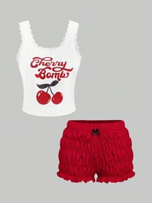 Kawaii Cherry Print Lace Patchwork Ruffle Bubble Shorts Camisole Casual Summer Pajama Set, Countryside Style