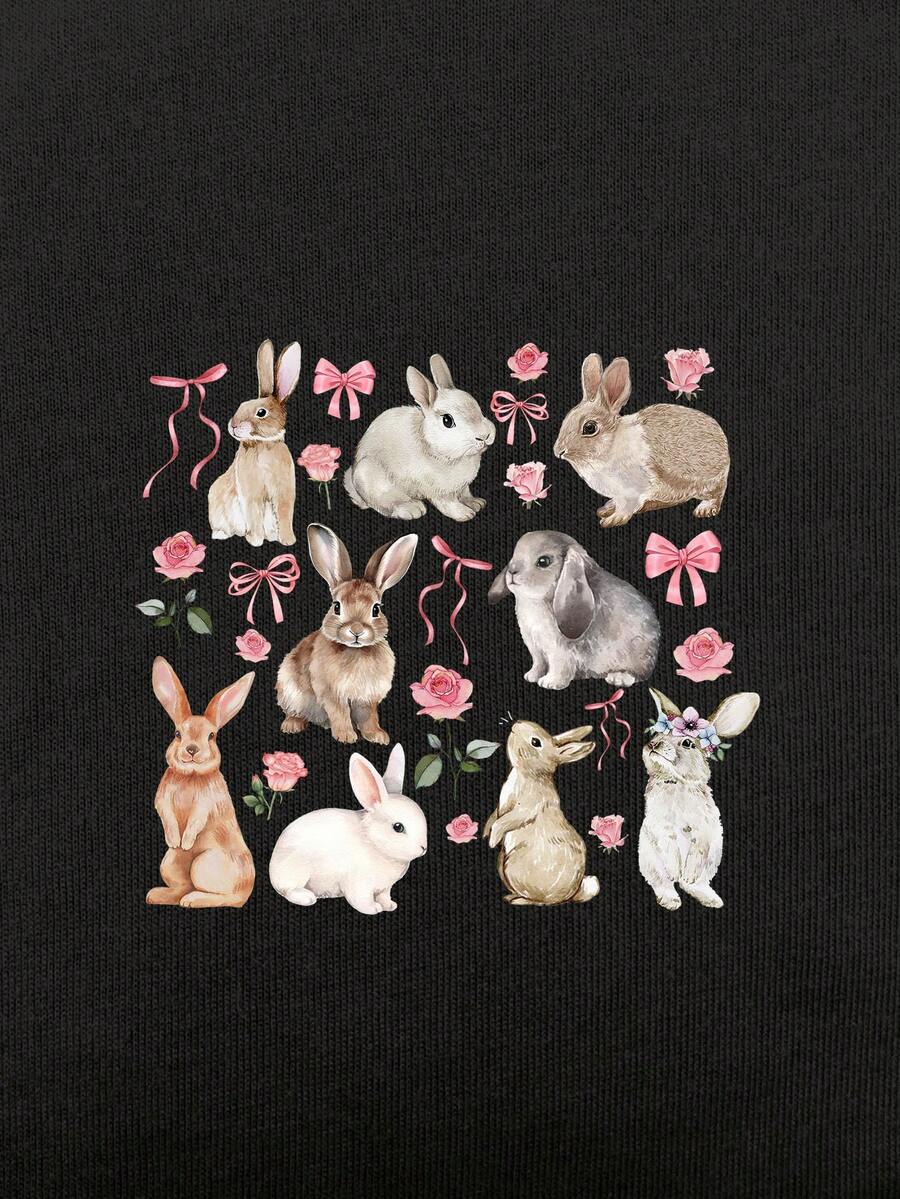 Kawaii Cute And Lovely Style Rabbit & Floral Print Women's Short Sleeve T-Shirt, School