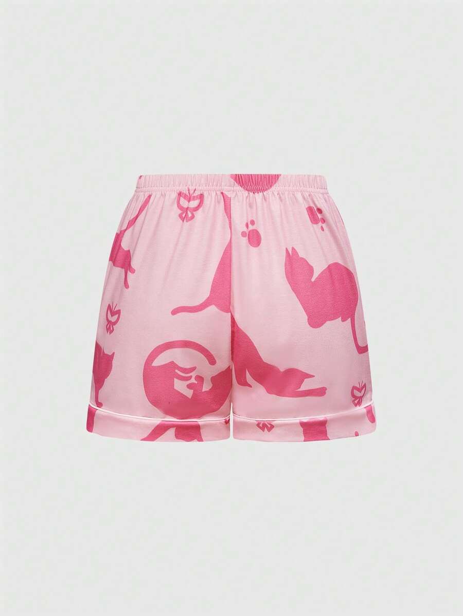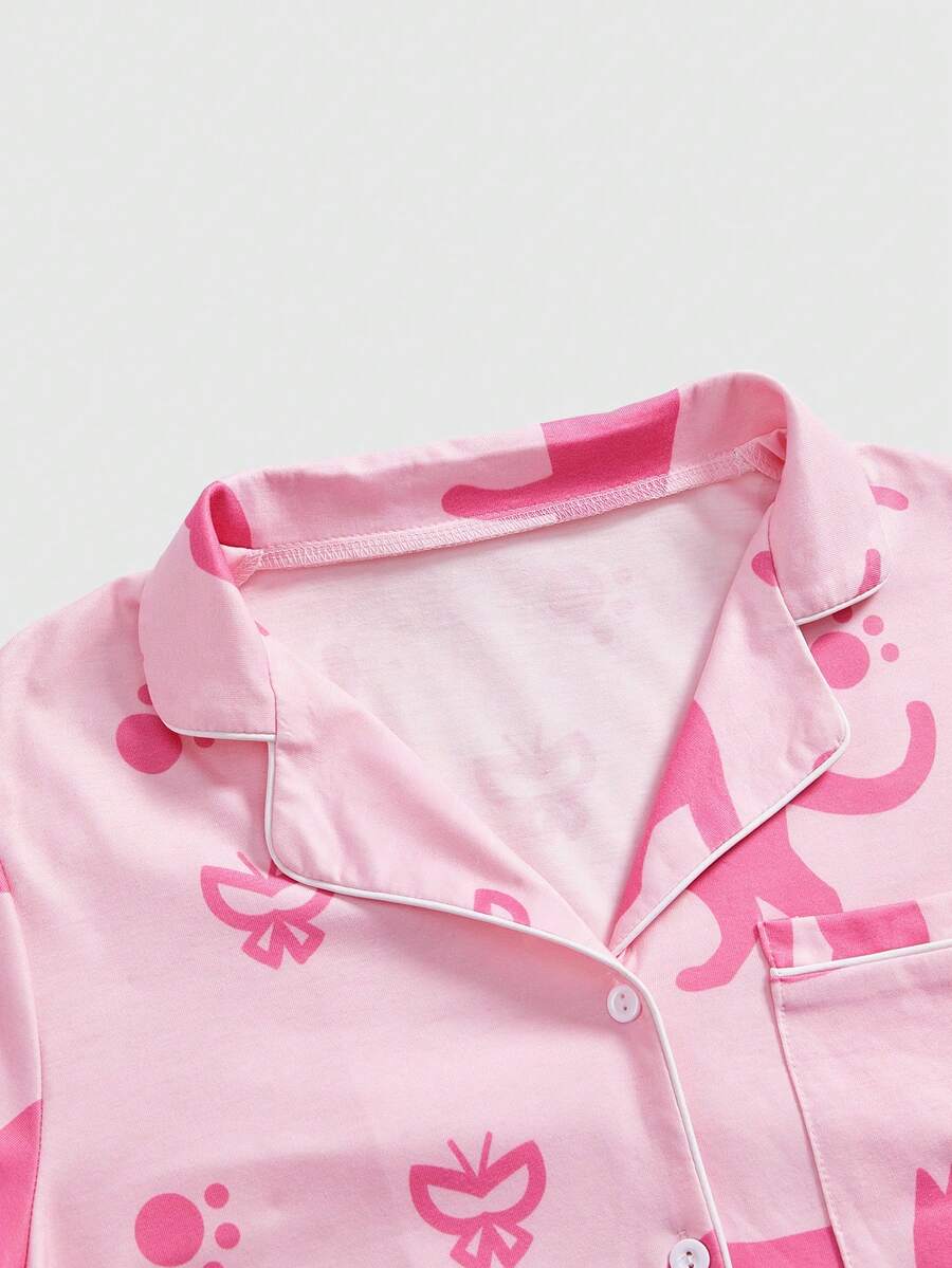Kawaii Cute Cat Print Lapel Shirt And Shorts 2 Pieces Casual Pajama Set For Women, Summer