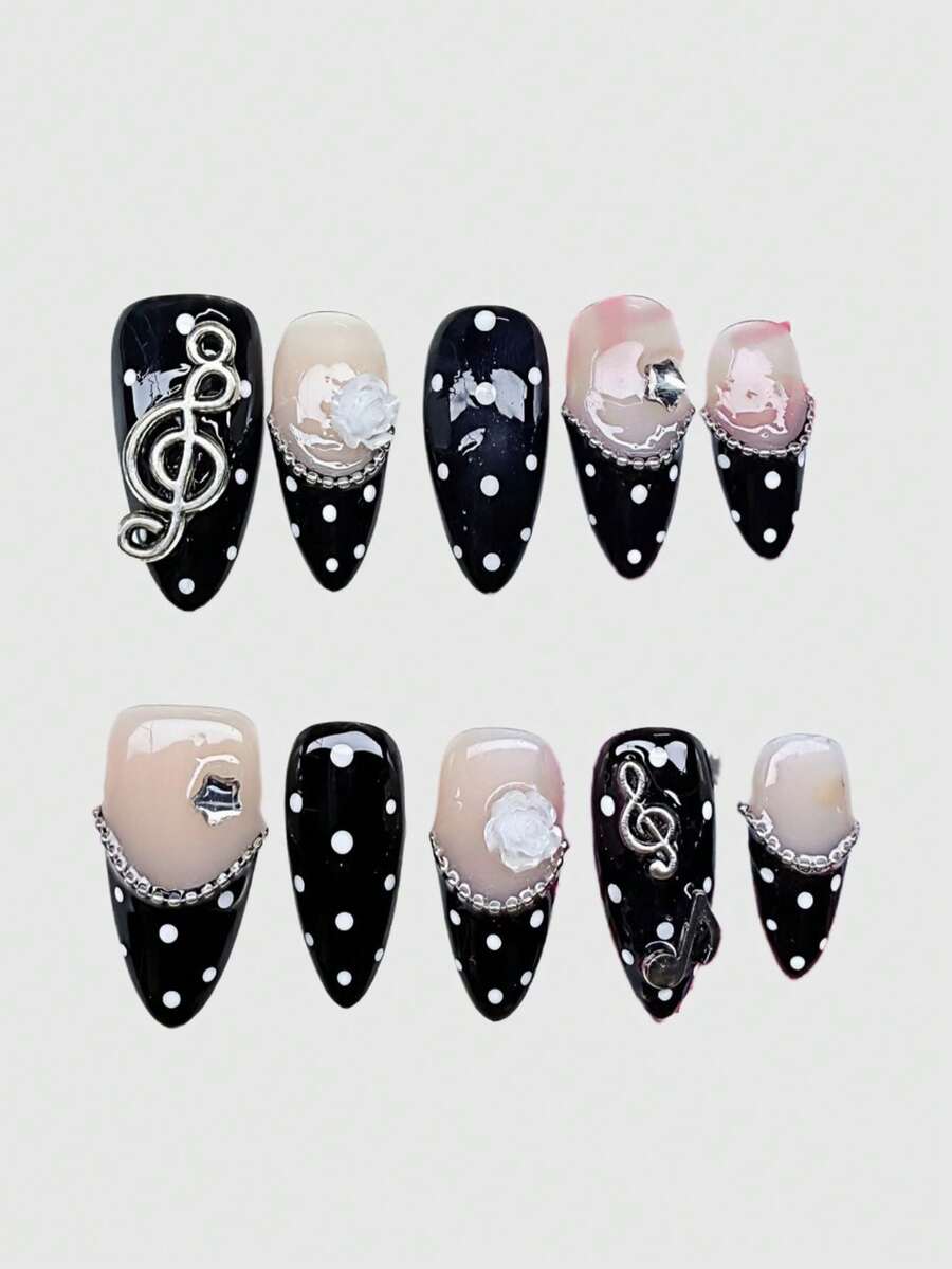Kawaii Cute Lace Edged Romantic Heart Ballerina Style Bow White Wings Metal Music Note Pink Series Handmade False Nail Tips, Mass Produced Energetic Girl Wear, Suitable For Daily Outings And Dates
