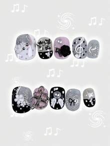 Kawaii Cute Lace Edged Romantic Heart Ballerina Style Bow White Wings Metal Music Note Pink Series Handmade False Nail Tips, Mass Produced Energetic Girl Wear, Suitable For Daily Outings And Dates