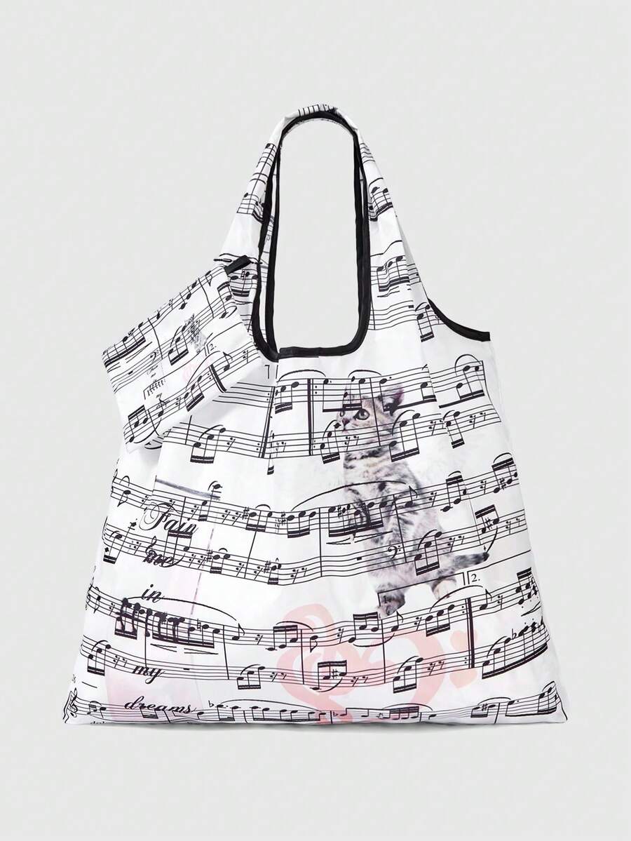 Kawaii Fashionable All-Over Heart & Music Note Pattern Large Capacity Foldable Tote Bag With Coin Purse, Portable Shopping Bag