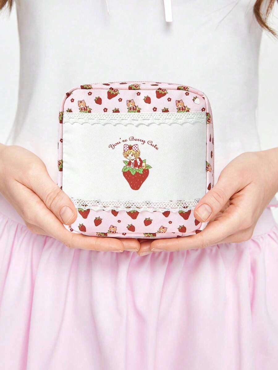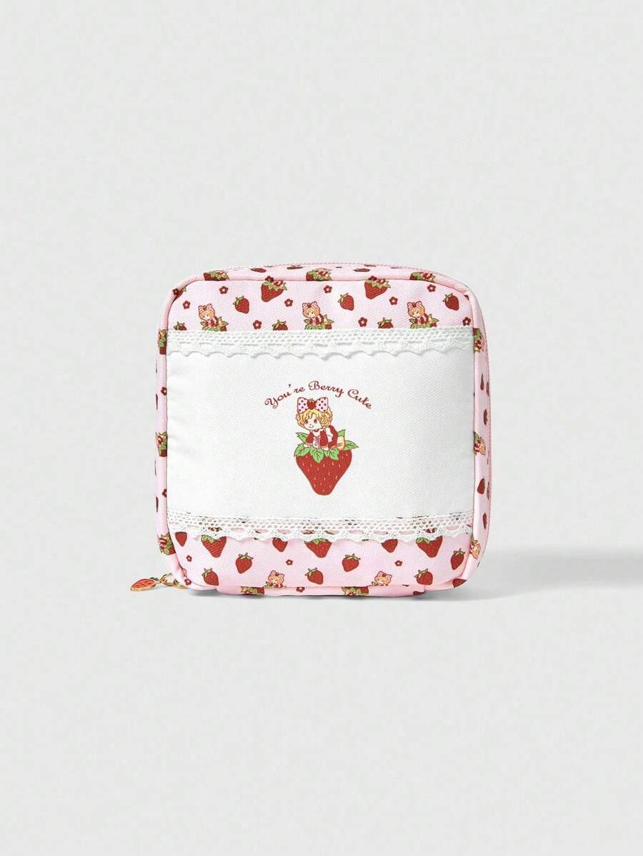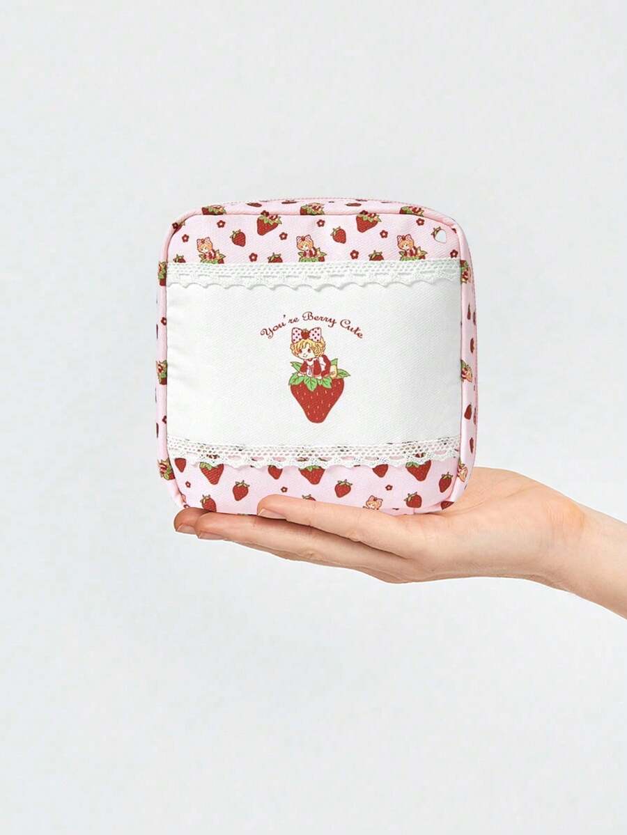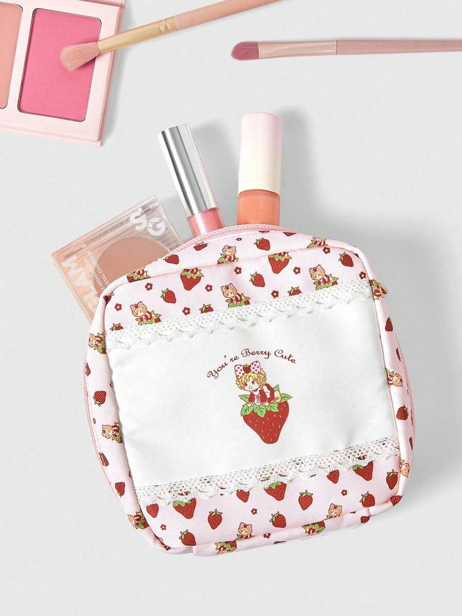 Kawaii Fashionable Cartoon Contrast Lace 2 Grid Retro Girl Thick Padded Large Capacity Portable Cosmetic Bag, Small Square Bag 442464