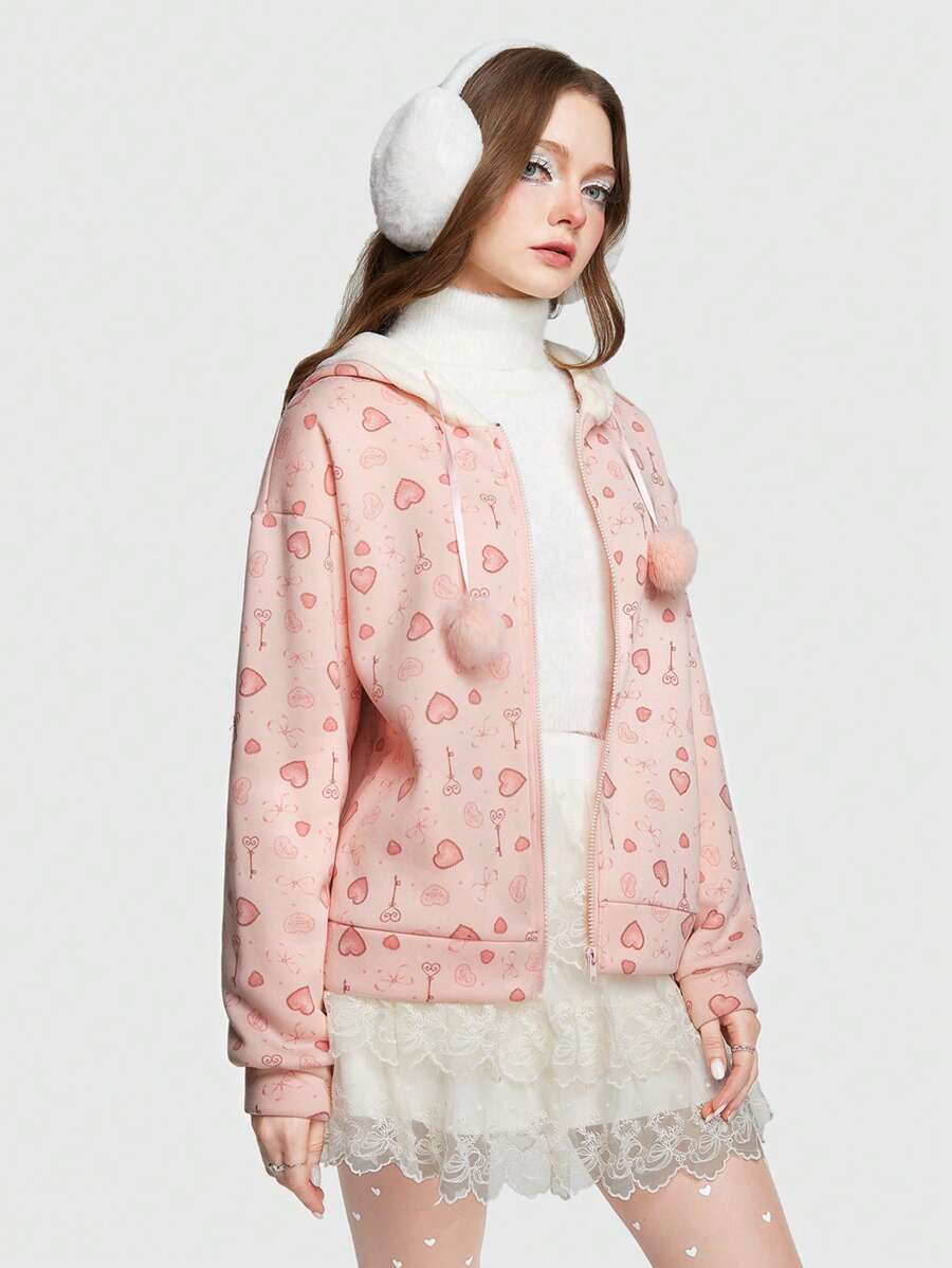 Kawaii Heart Print Zip Up Pom Pom Drawstring Hooded Coat