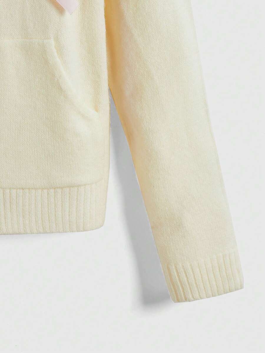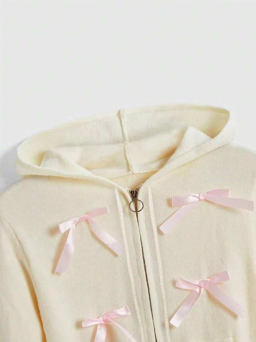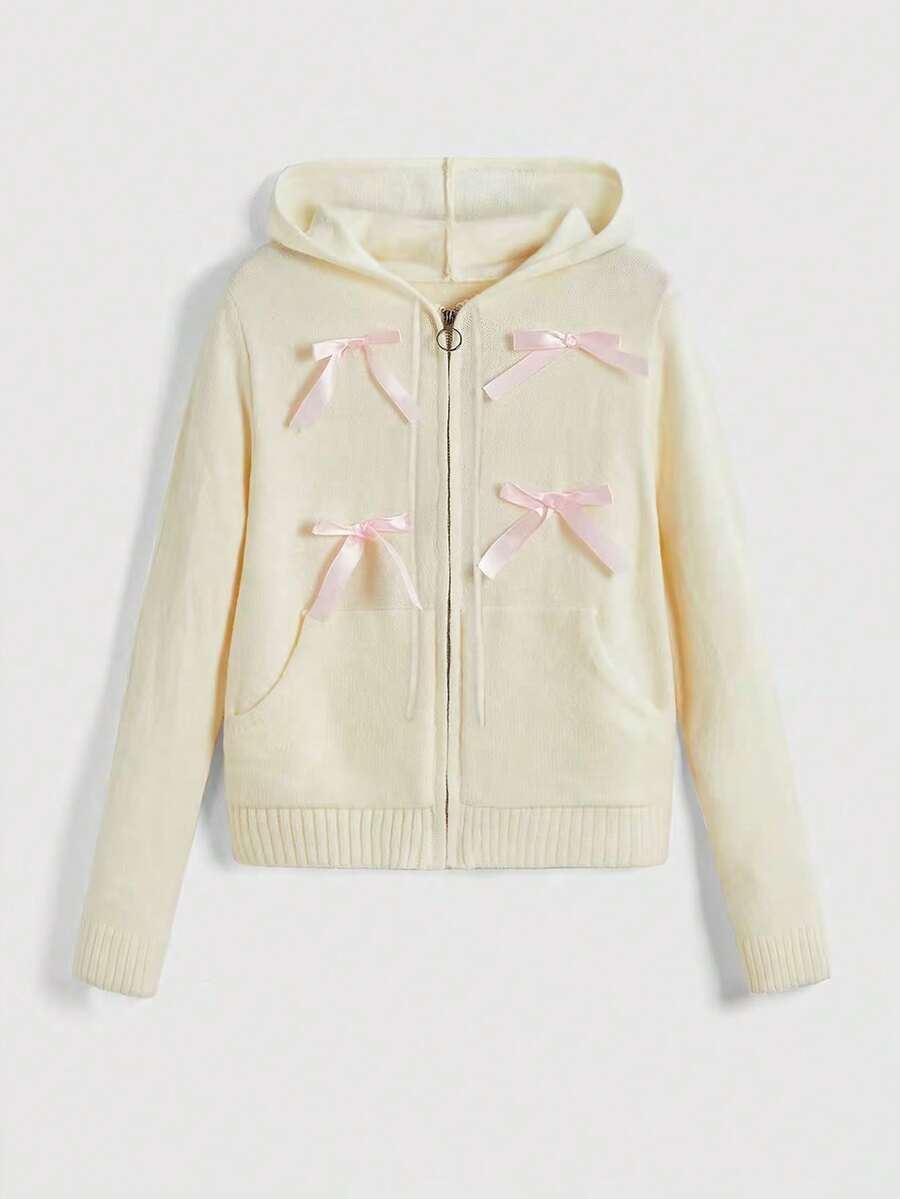 Kawaii Himekaji Cute Apricot & Pink Bowknot Zipper Pocket Cardigan Sweater For Women, Spring