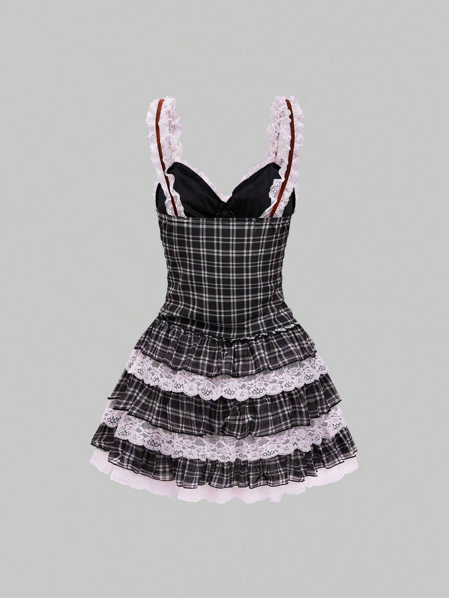 Kawaii Himekaji Vintage Sweet Mesh Plaid Cake Lace Ruffle Bow Decor Ladies Short Dress