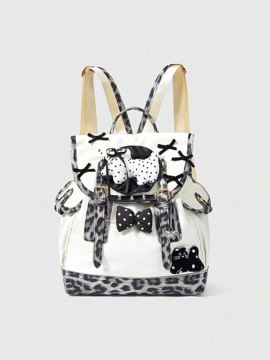 Kawaii Leopard Print Patchwork Cat & Dog Bow Decor Backpack
