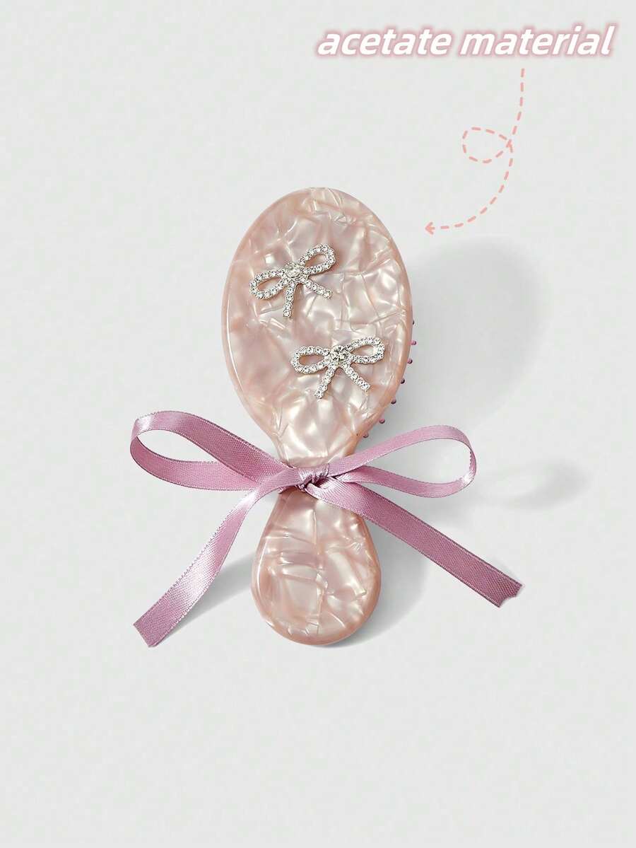 Kawaii Mini Handheld Cushion Hair Brush With Shiny Rhinestone Bow Print, Massage Scalp Detangling Comb