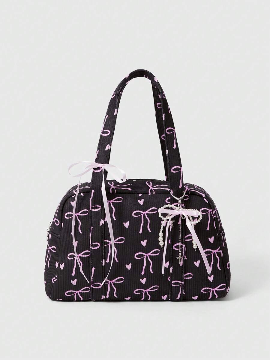 Kawaii Pink Bowknot Corduroy Fashionable Portable Bowknot Heart Print Ladies Handbag