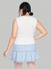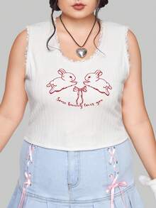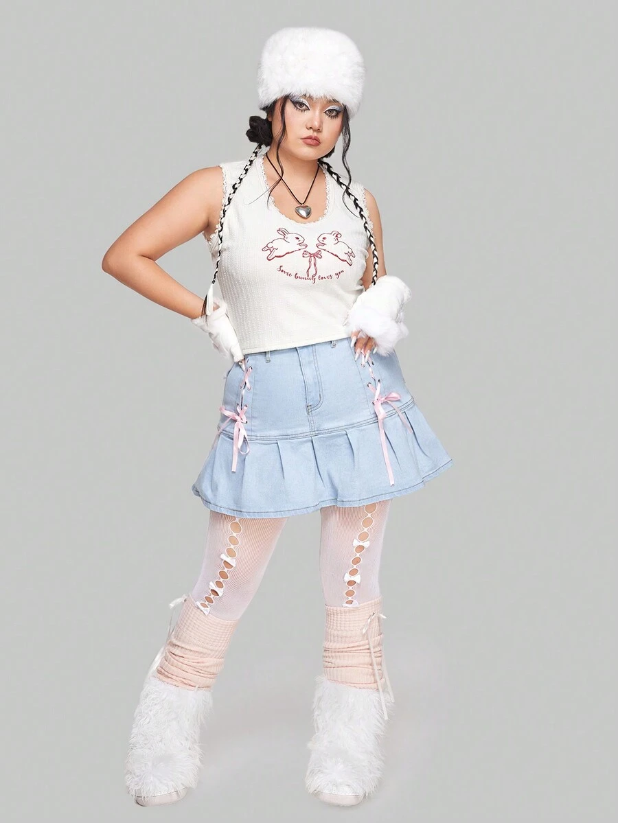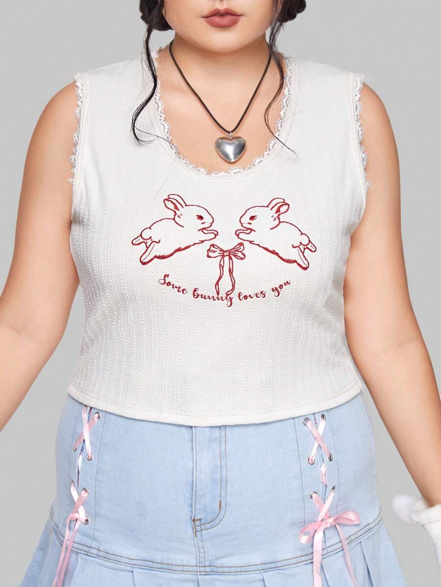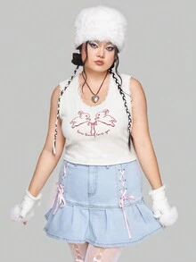 Kawaii Plus Embroidery Cartoon and Slogan Pattern Lace Trim Tank Top