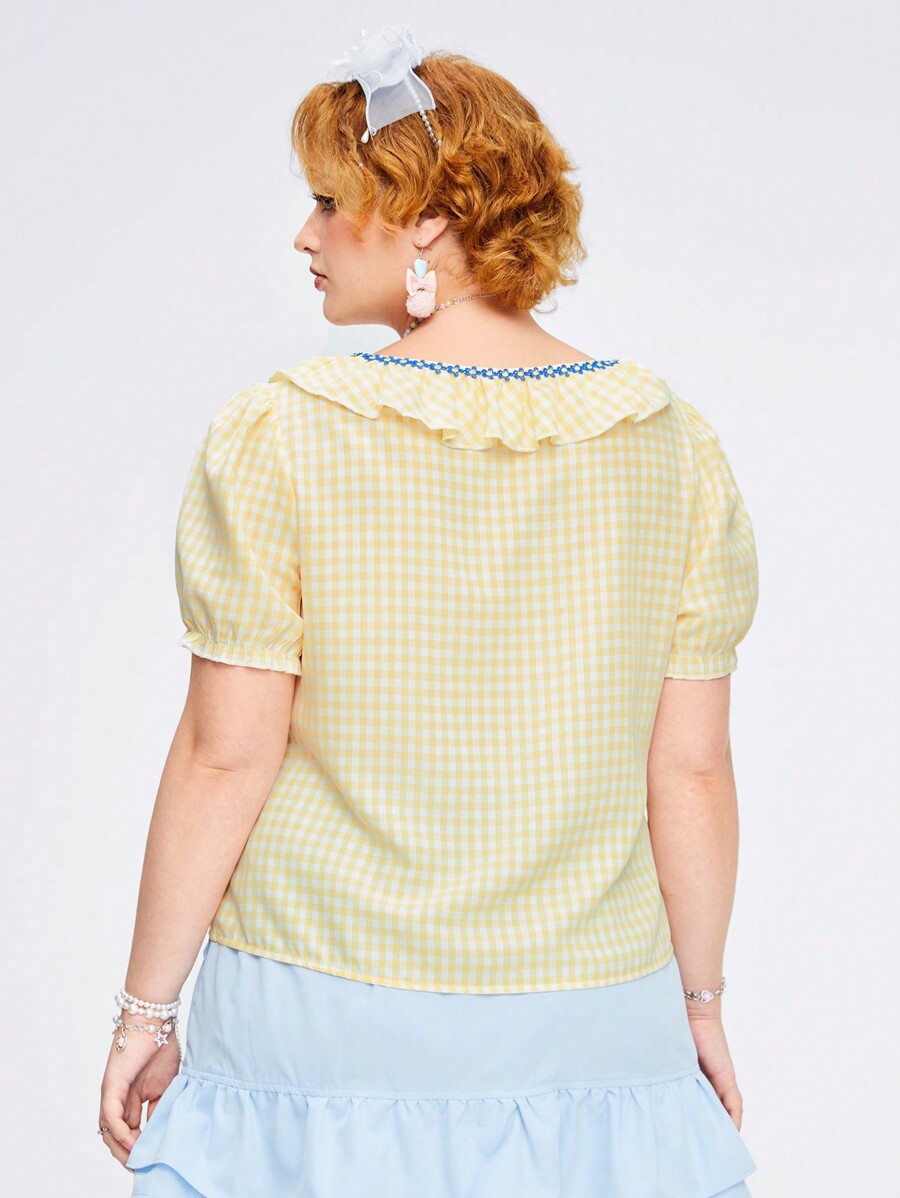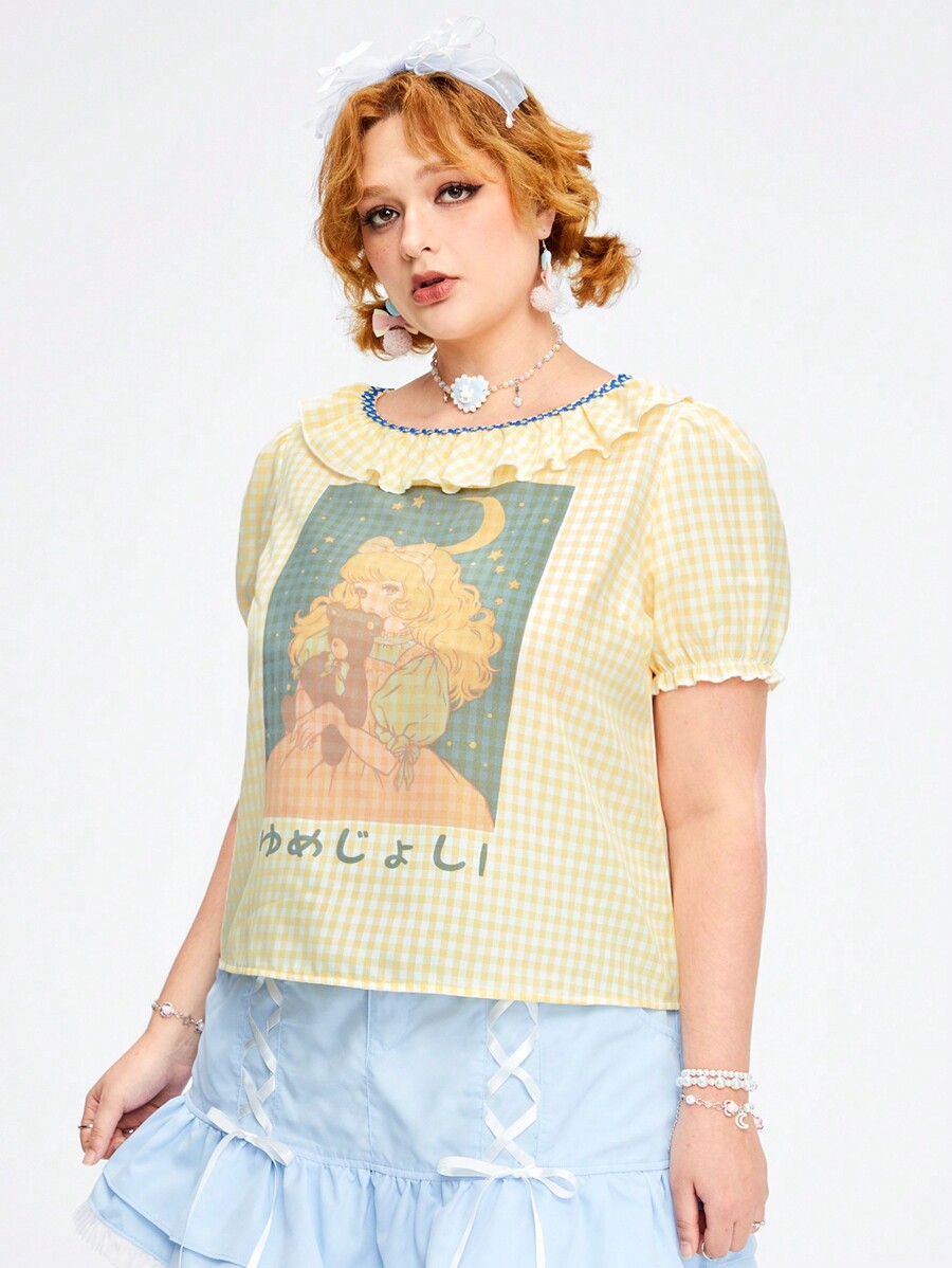 Kawaii Plus Size Cute Cartoon Print & Gingham Plaid Frill Trim Blouse