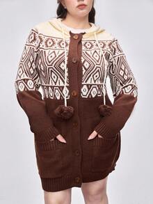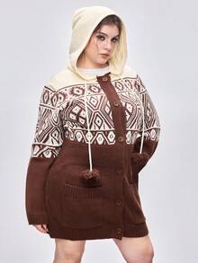 Kawaii Plus Size Fair Isle Sweater, Women's Geometric Pattern Christmas Holiday Casual Knitted Hooded Cardigan, Plus Size Autumn/Winter Women Knitted Cardigan