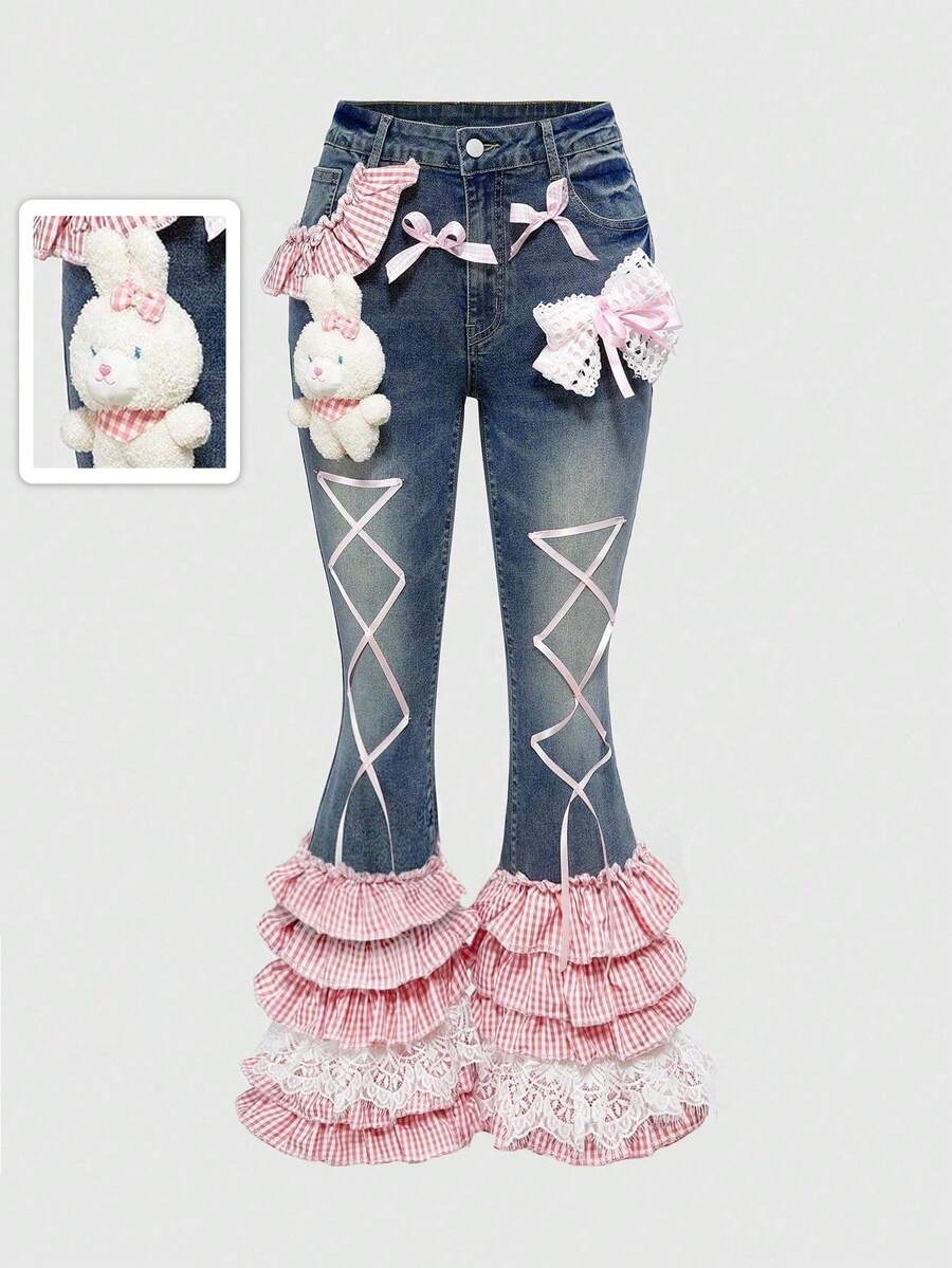 Kawaii Plus Size Women Y2K Teen Plaid Lace Rabbit Pendant Bow Bell Bottom Flare Pants