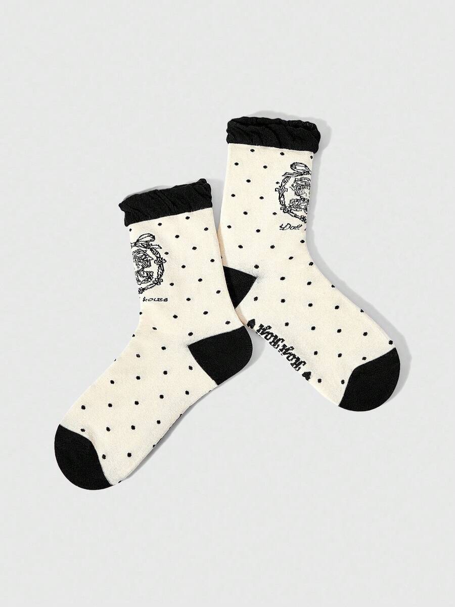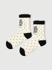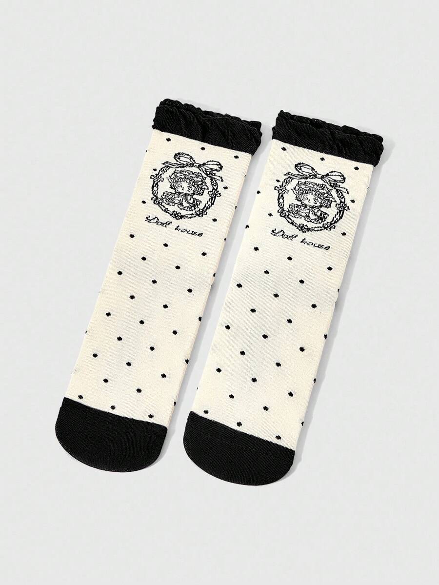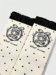 Kawaii Polka Dot Doll Print Ruffle Mid-Calf Socks, Cute & Fashionable Versatile Lolita Style Socks For All Seasons