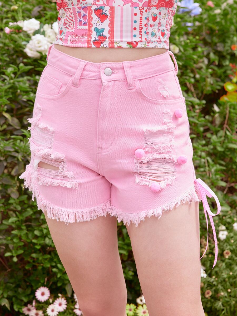 Kawaii Pom Pom Ripped Denim Shorts