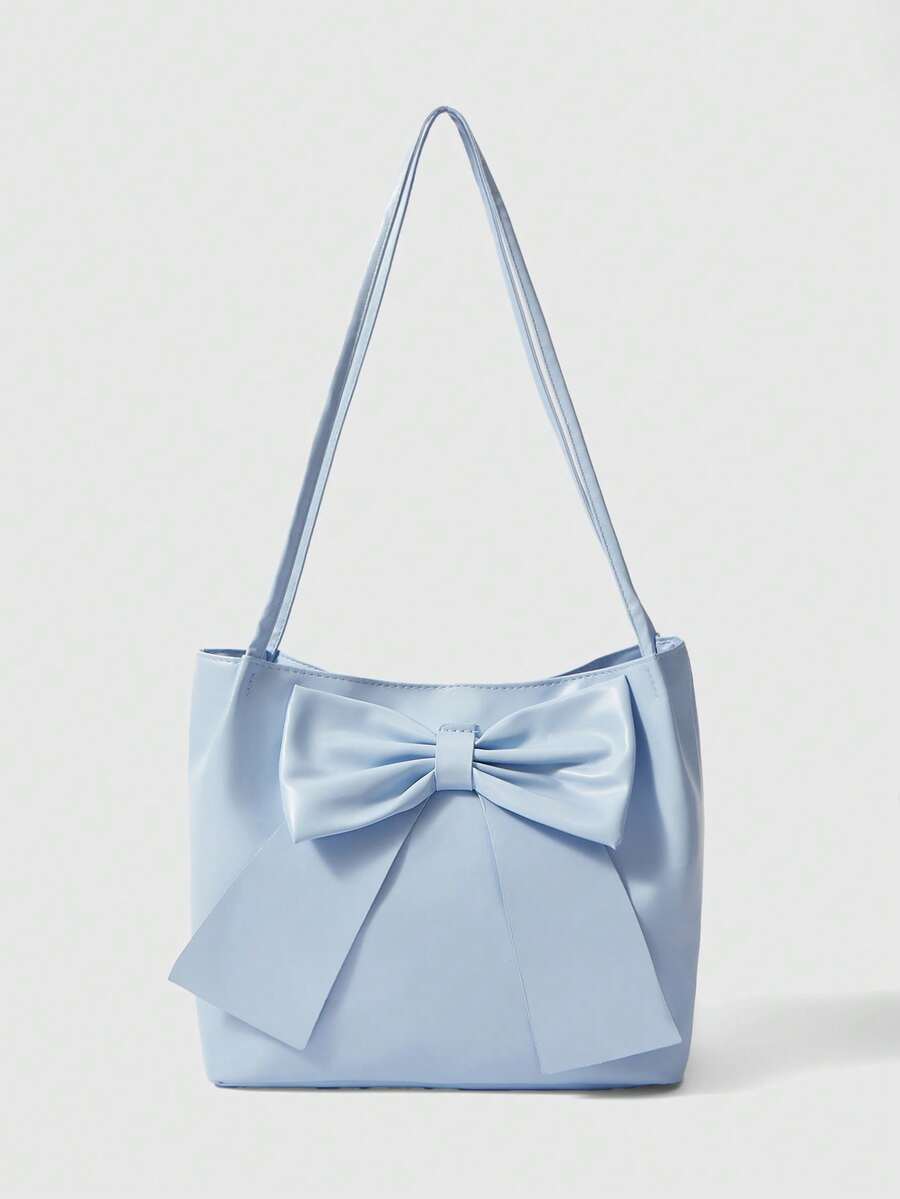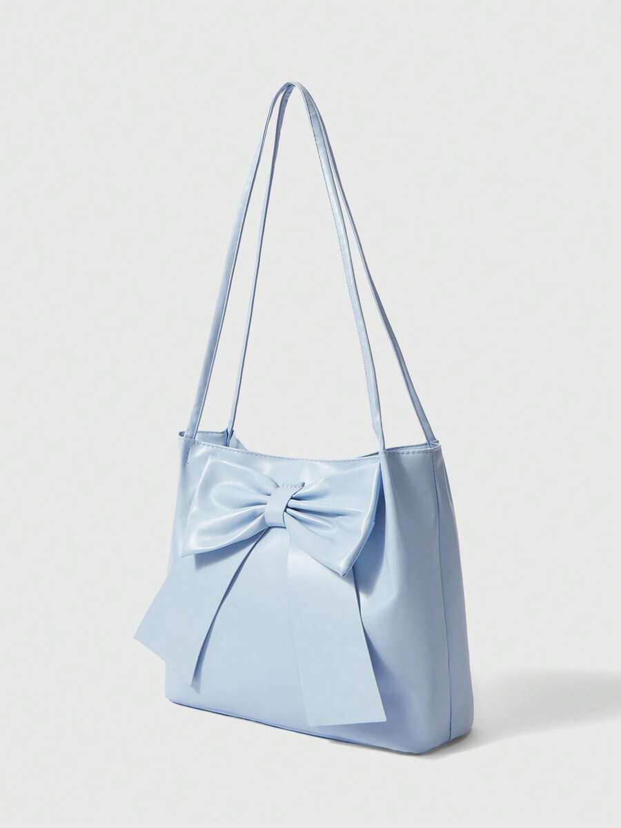 Kawaii Solid Color PU Leather Bow Decor Lightweight Fashionable Women Large Capacity Shoulder Bag, Elegant Lady Handbag