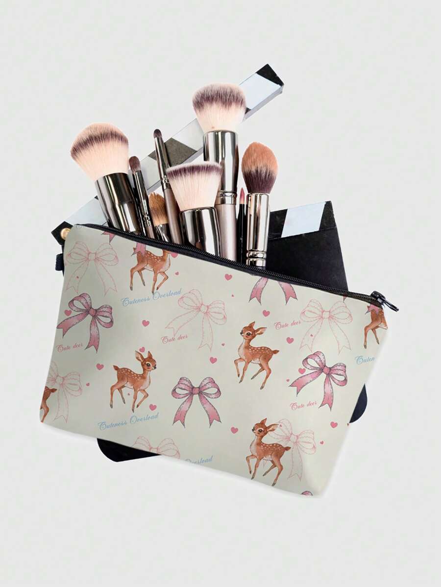 Kawaii Style No. 1040292 Valentine's Day Heart, Bow, Deer Polyester Portable Zipper Cosmetic Bag, Women Makeup Bag Travel Organizer Toiletry Pouch, Holiday Gift