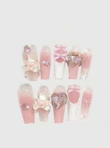 Valentine's Day Kawaii Sweet Cute Heart Teddy Bear, Romantic French Bowknot, Pearl, Star Decor Long Square False Nail Tips, Fake Nails