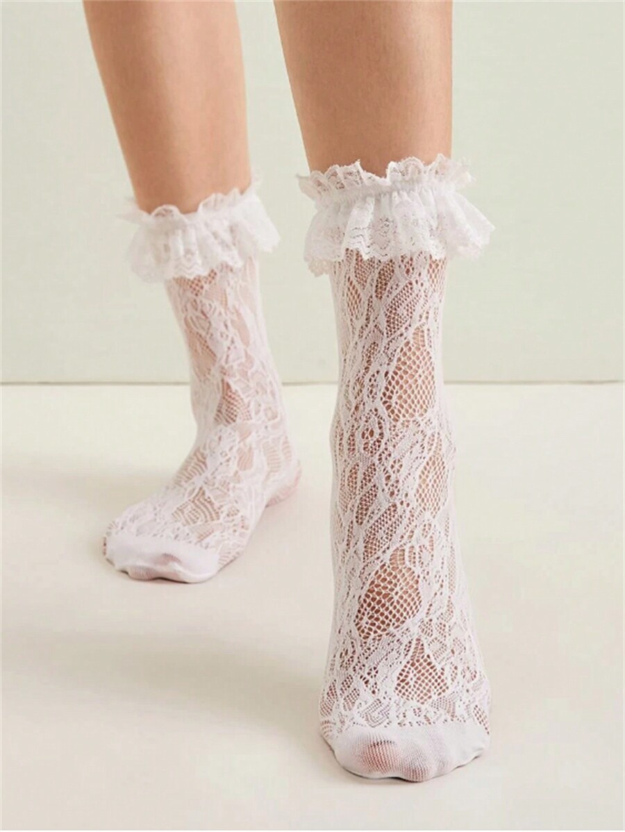 Kawaii White Lace Trimmed Mid-Calf Socks For Women