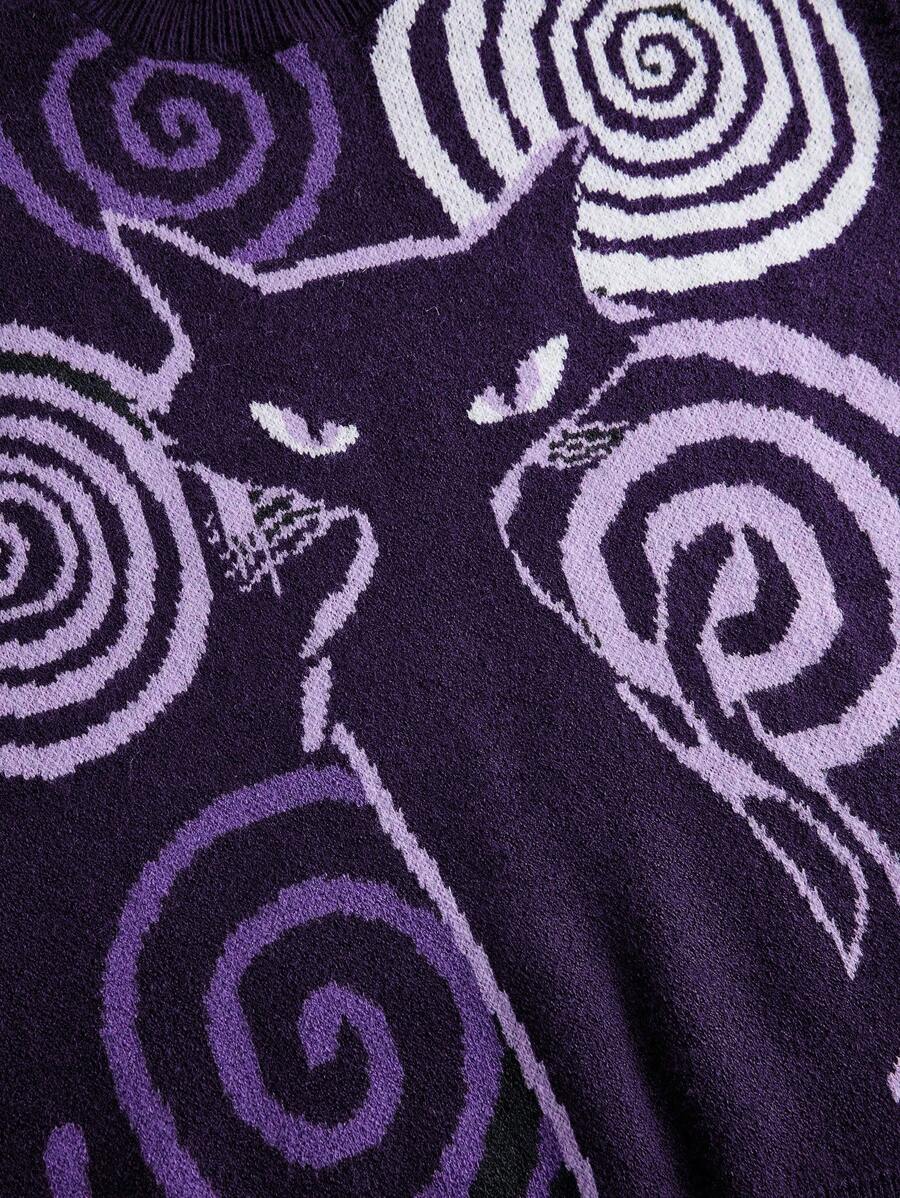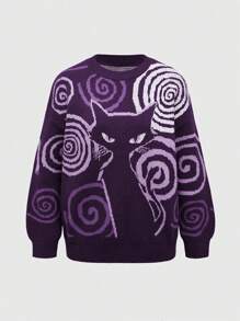 Kawaii Women Casual Round Neck Drop Shoulder Long Sleeve Sweatshirt With Cat Spiral Pattern, Autumn/Winter