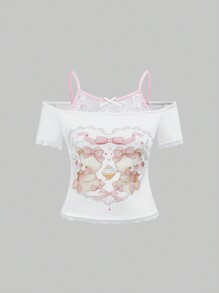 Kawaii Women's 2 In 1 Cute Girl Style Lace Patchwork Heart & Bear Lace Trim Bow T-Shirt
