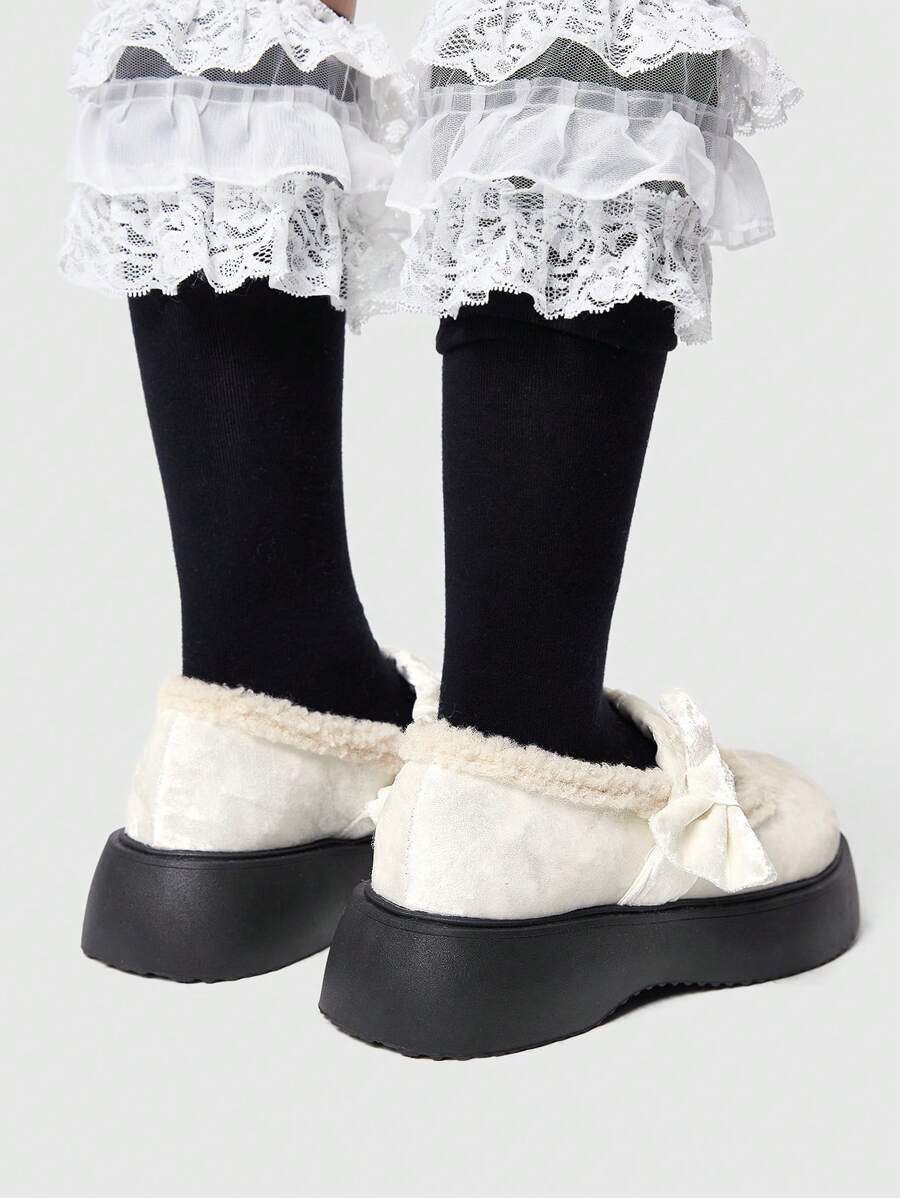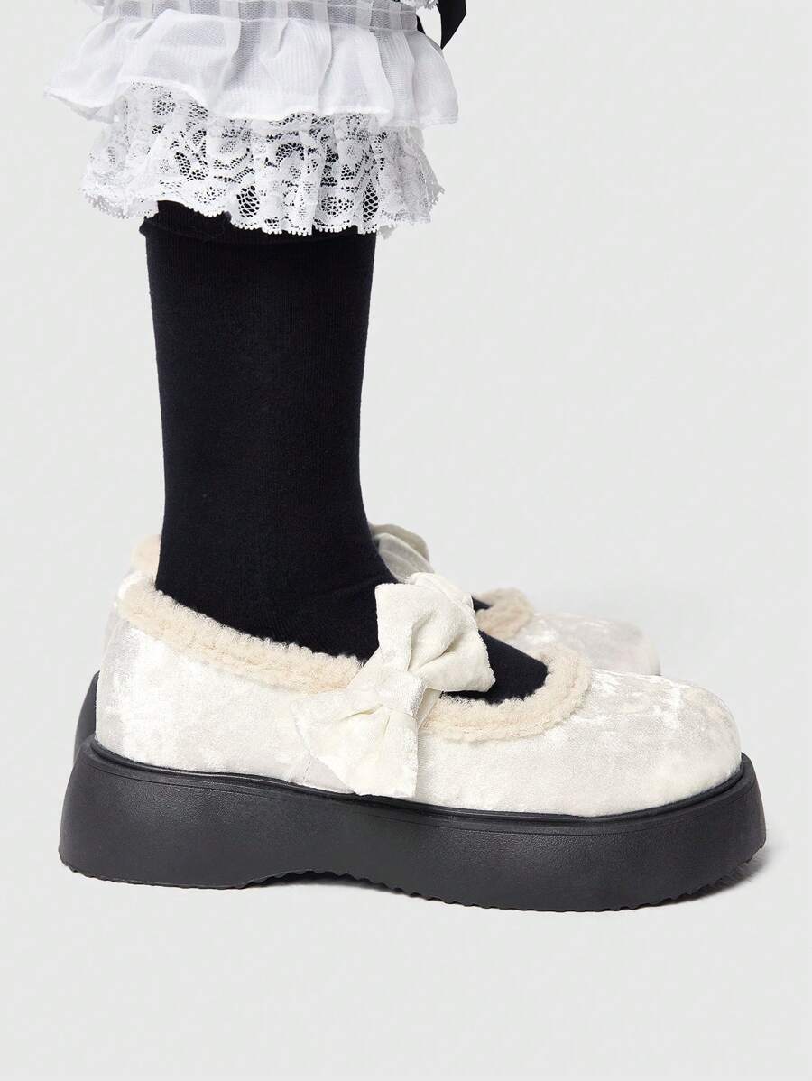 Kawaii Women's Bow-Knot Fluffy Trim Round Toe Platform Mary Jane Flats, Silver, Casual/Party/School For Christmas And New Year Holiday Vibe Fall And Winter