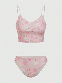Women's Cartoon Rabbit & Strawberry Print Patchwork Lace Lingerie Set, Kawaii