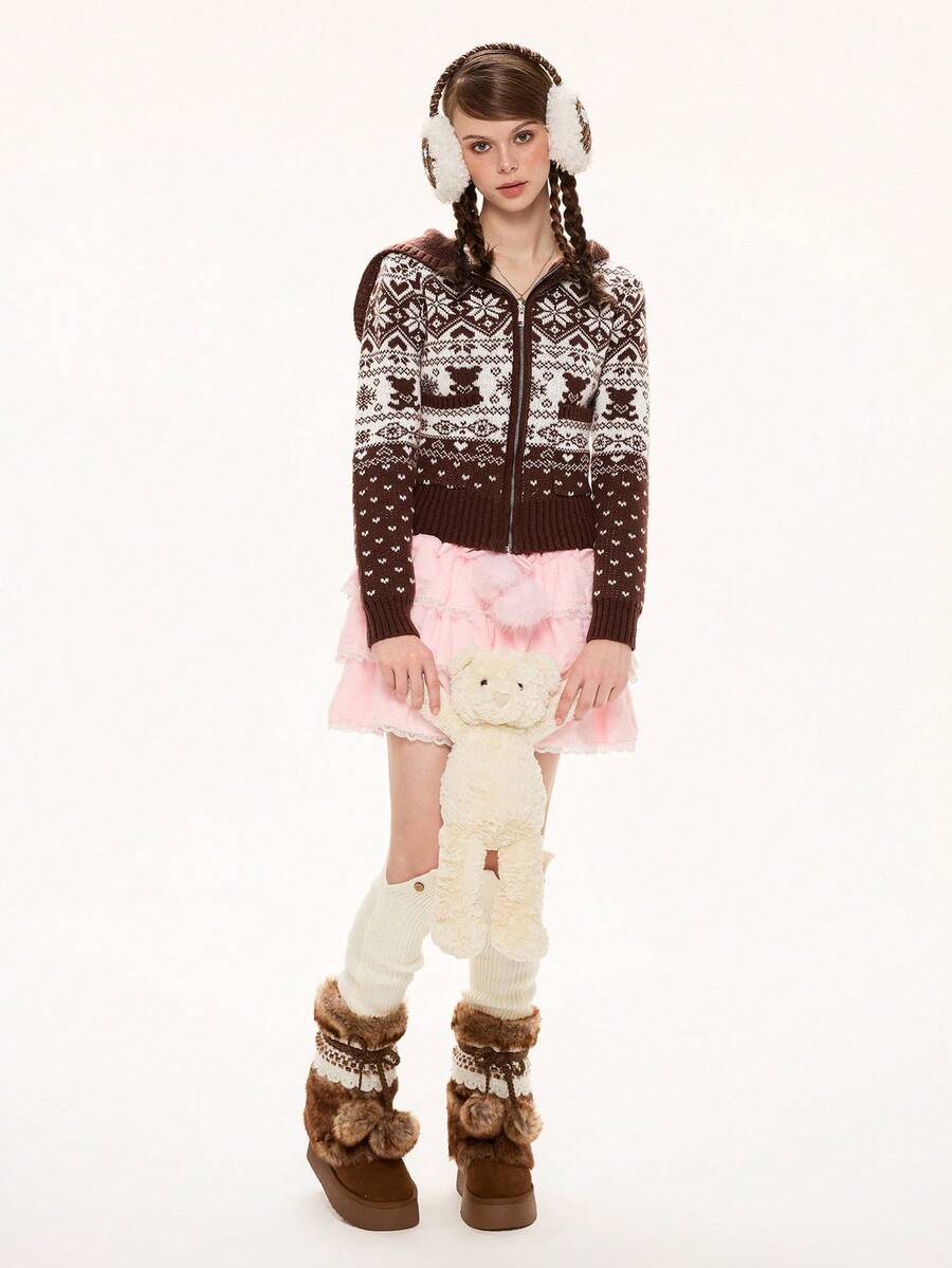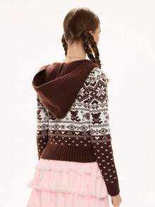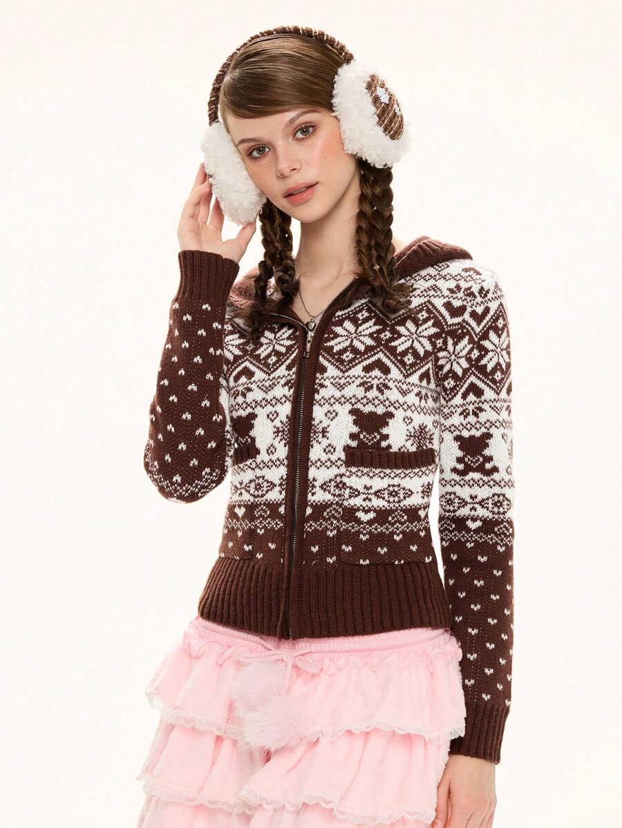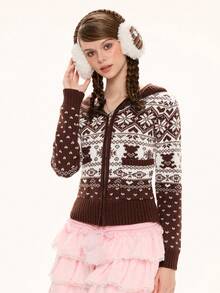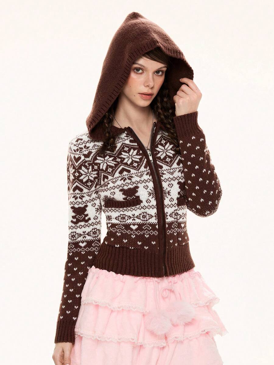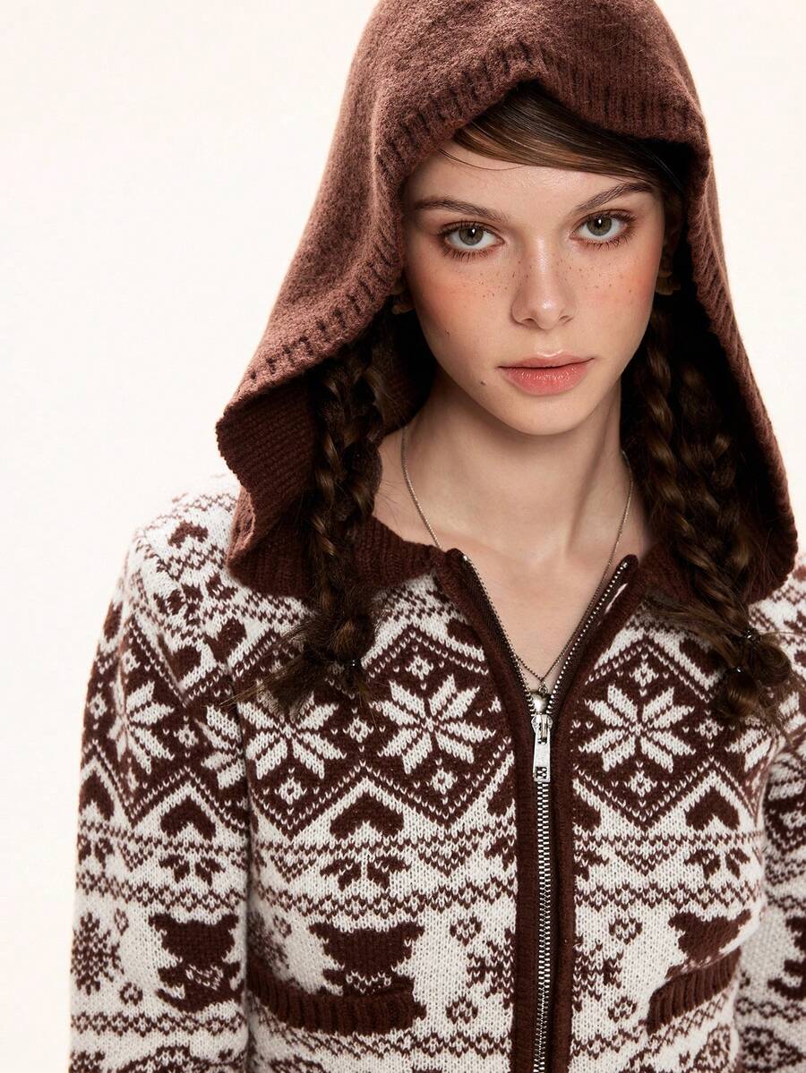Kawaii Women's Casual Geometric Pattern Zip-Up Hooded Cardigan, Autumn/Winter