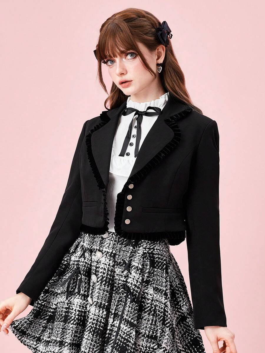 Kawaii Women's Cropped Fit Metal Button Velvet Trim Collegiate Style Blazer, School