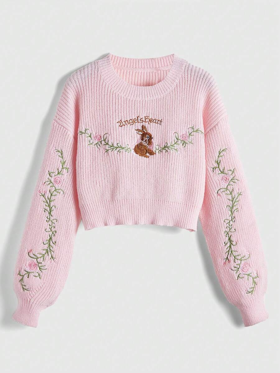 Kawaii Women's Cute Rabbit, Letter, Rose, And Ivy Embroidery Lantern Sleeve Sweater