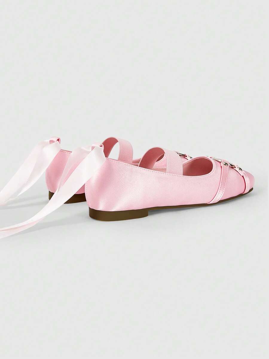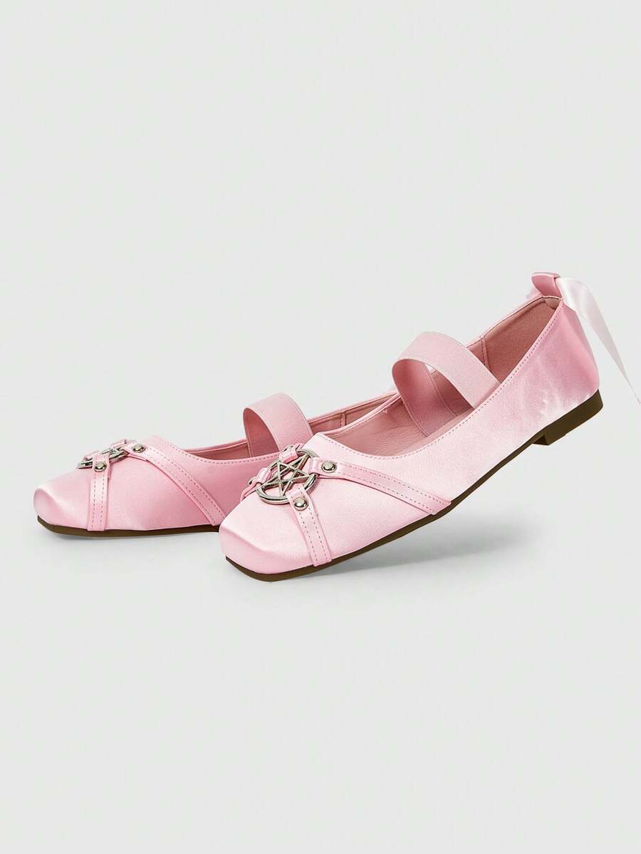 Kawaii Women's Elegant & Fashion Square Toe Buckle Star Ballet Flats, Sweet Punk Style Flat Shoes, Versatile For Party, Daily Wear, Evening Dress, Pink