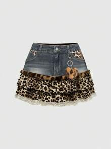Kawaii Women's Fashionable Leopard Patchwork Decorative Denim Mini Skirt