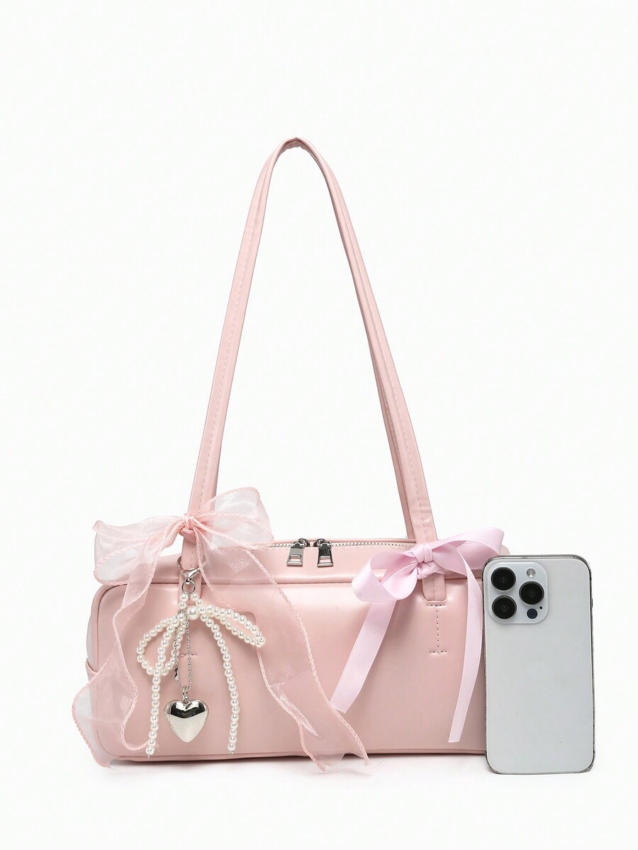 Kawaii Women's Vintage Cute Bowknot Belted Boston Shoulder Bag With Heart Ornament And Multiple Pockets
