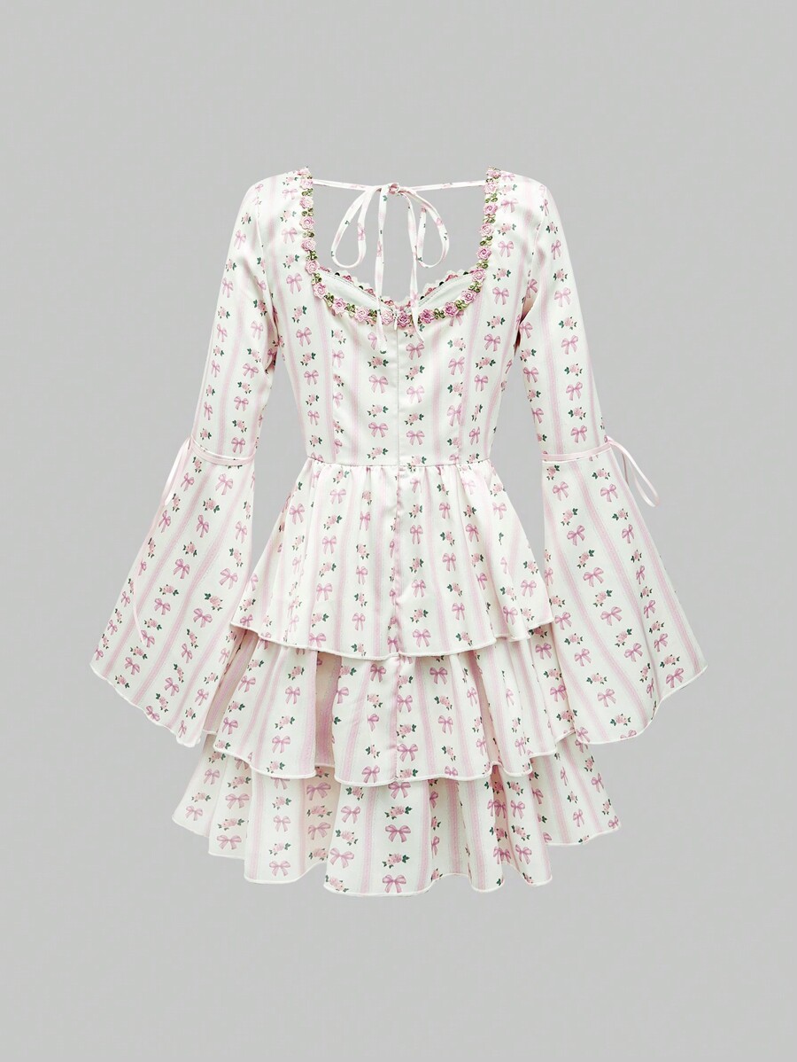 Kawaii Women's Vintage Short Ditsy Floral A-Line Dress With Sweetheart Neckline And Bell Sleeves