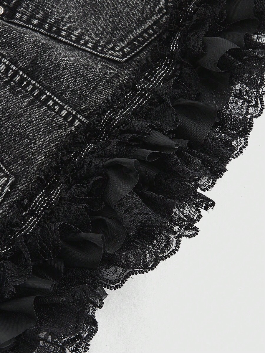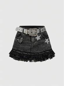 Kawaii Women's Y2K Rhinestone Pentagram Contrast Lace Hem Denim Mini Skirt