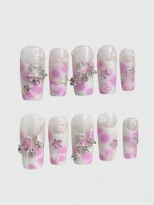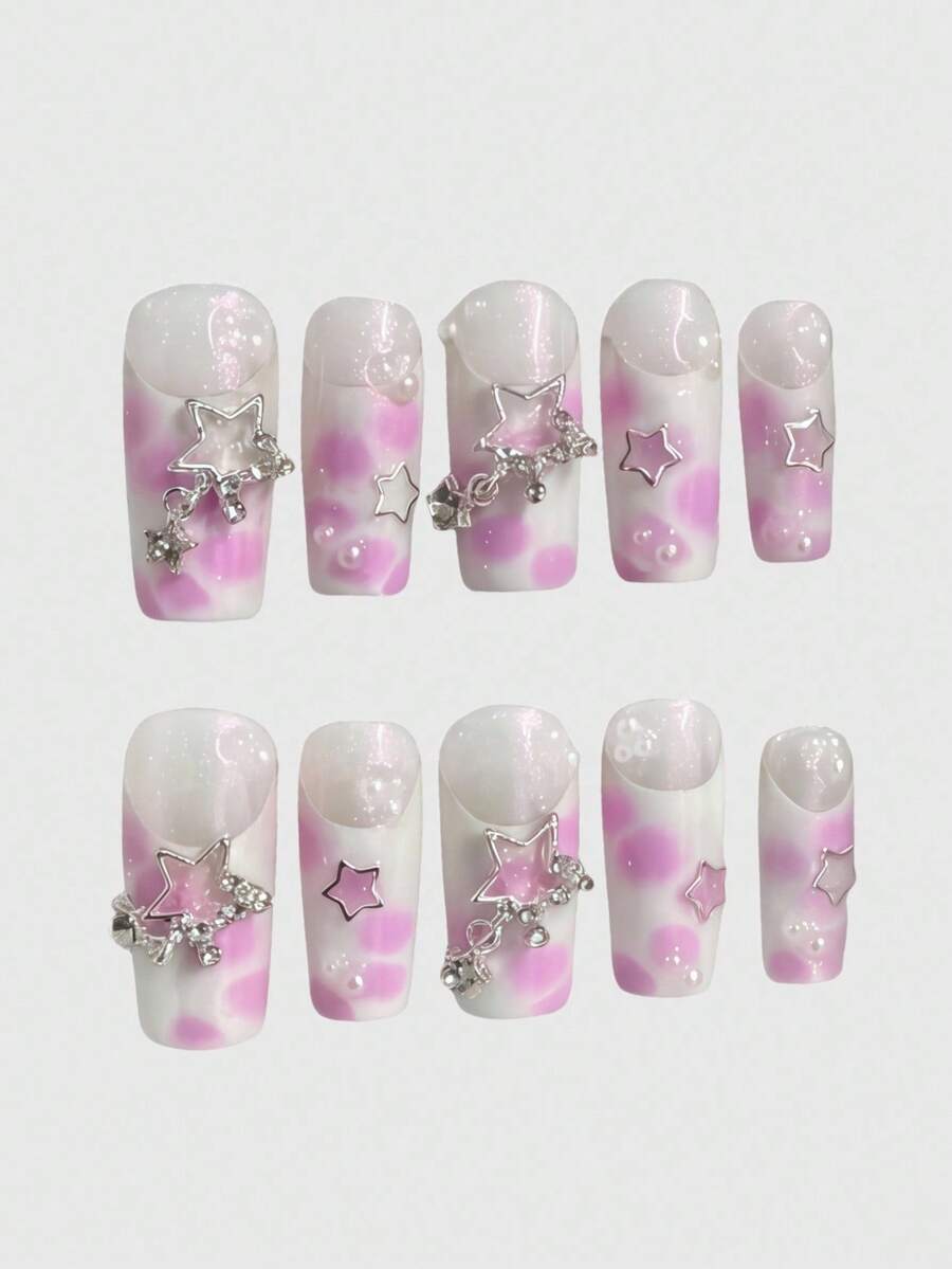 Kawaii Y2K Punk Style Pink Metallic Star French Polka Dot Animal Print Long Handmade False Nails, Pink Sweet & Hot Girls