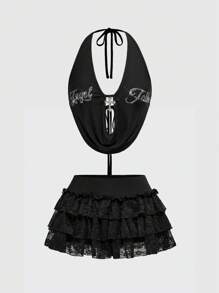 Kawaii Y2K Sexy Rhinestone Embellished Plunging Neck Ultra Short Low Waist Mini Skirt With Criss-Cross Back Bow 2 Pieces Set