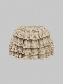 Kawaii Khaki Textured Fabric Sweet Cake Hem Patchwork Women's Low Waist Mini Skirt, Suitable For Multiple Occasions