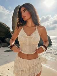 ROMWE Avant Vacation Beach Beaded Decor Backless Halter Hollow Out Knit Blouse