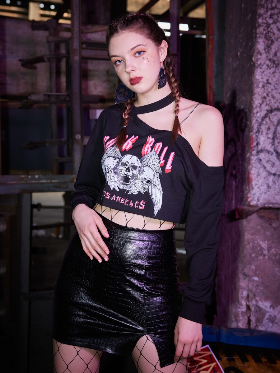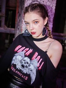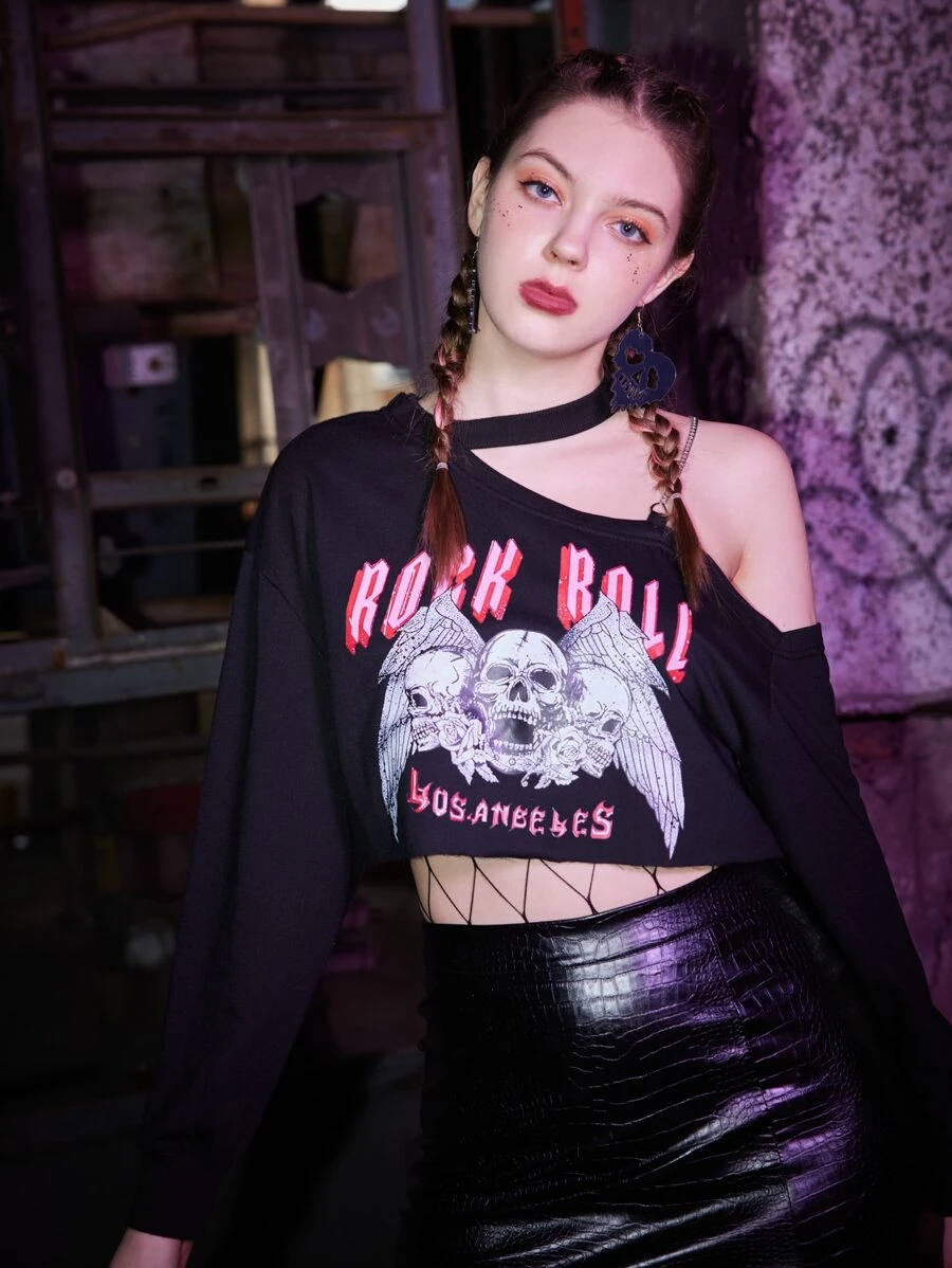 Grunge Punk Kpop Skull Graphic Asymmetrical Neck Sweatshirt