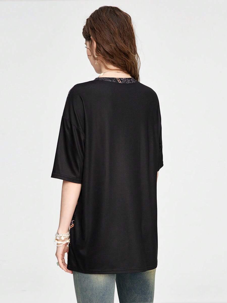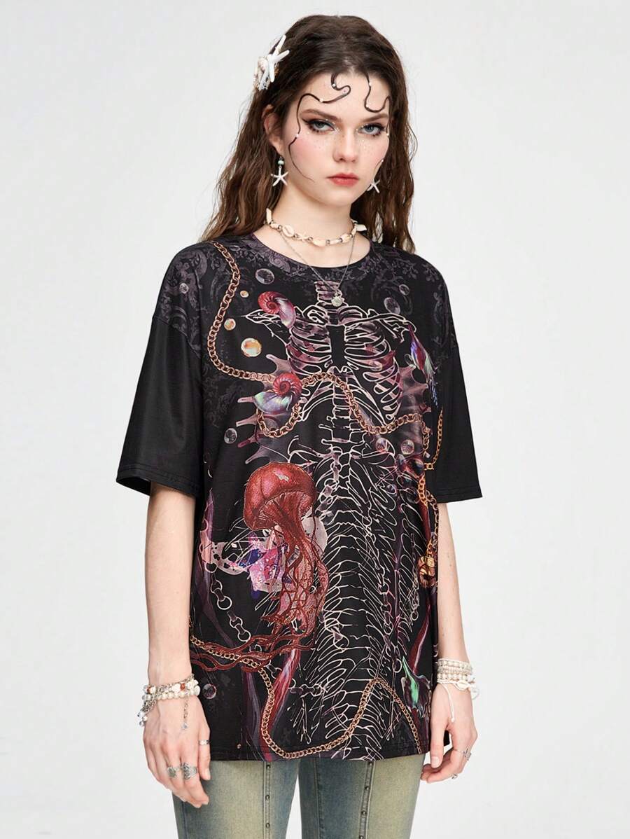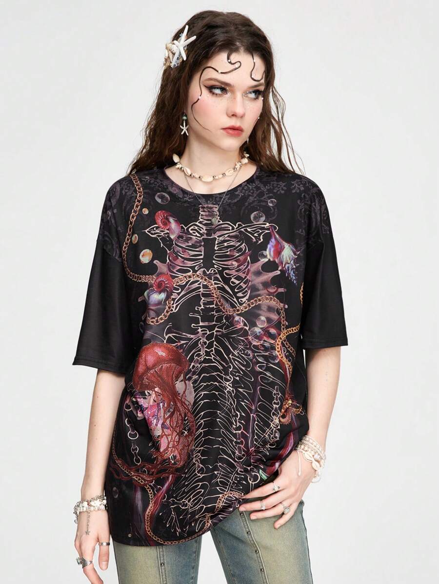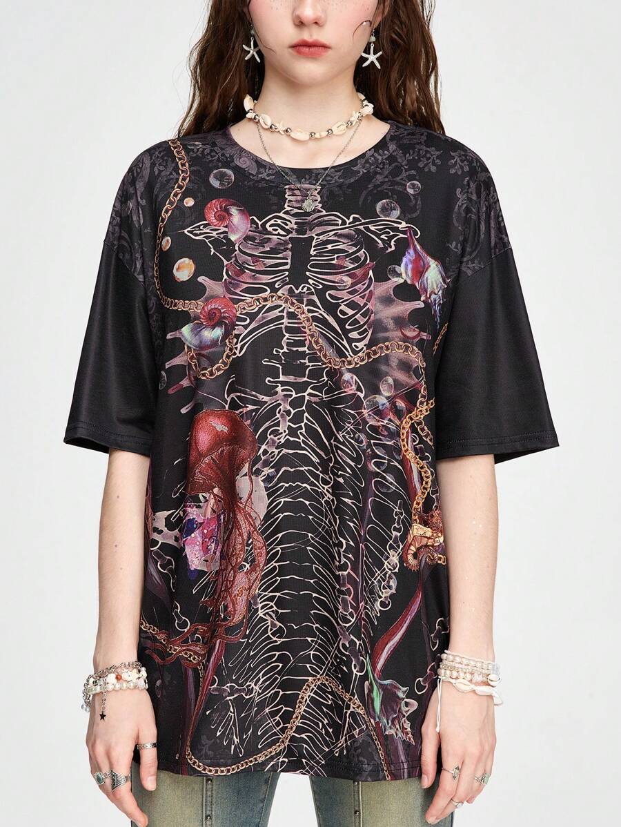 Ladies' Summer Fashionable Loose Short Sleeve T-Shirt With Skeleton Print
