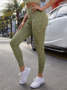 Leopard Pattern Cropped Yoga Leggings Wide Waistband Scrunch Butt Athletic Tights