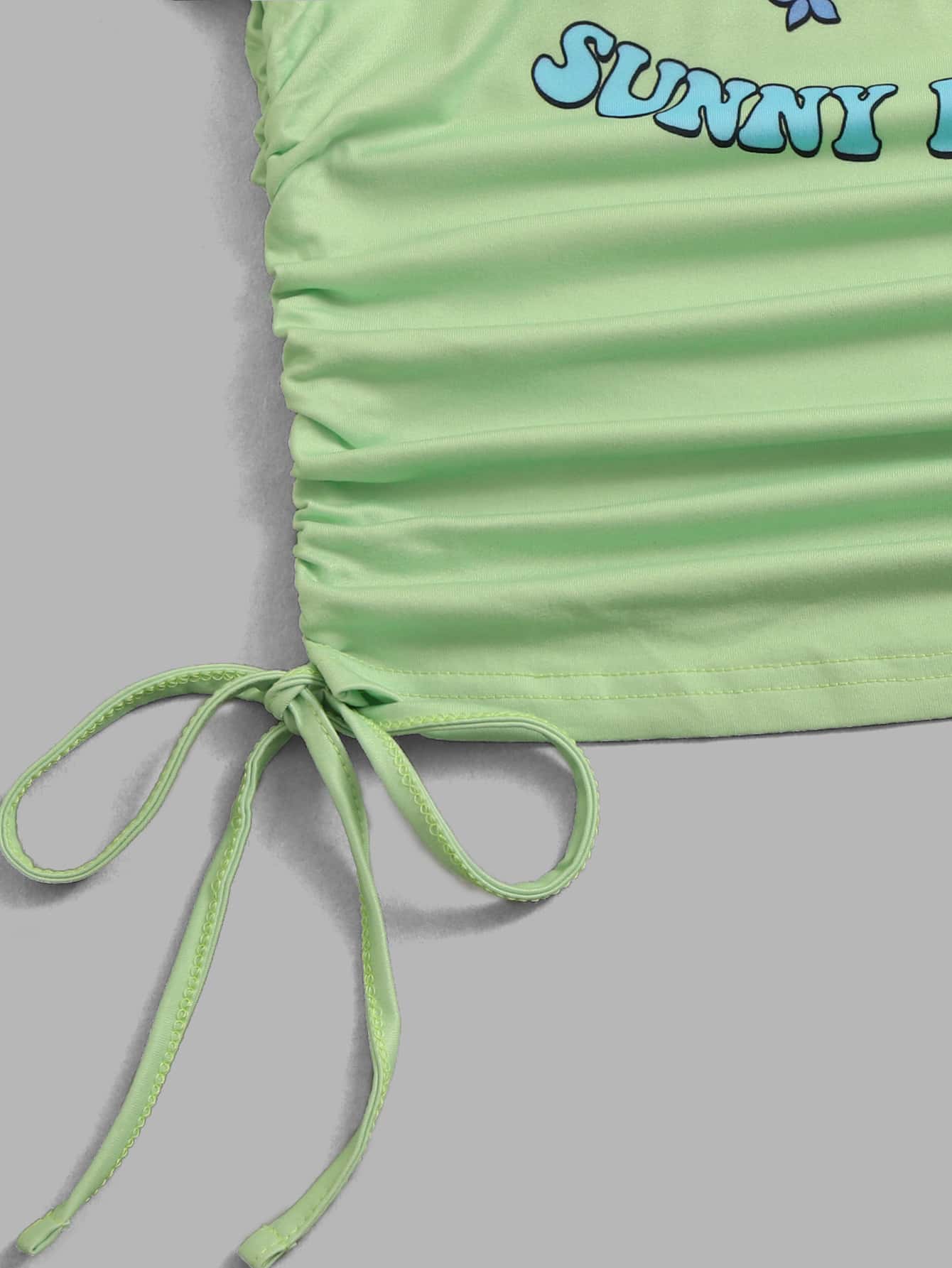 Letter Floral Graphic Colorblock Ruched Crop Tee