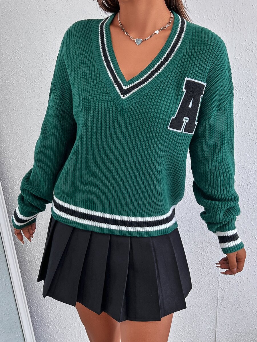 Letter Patched Striped Trim Sweater,Long Sleeve Tops Knit Pullover Fall Winter Outfit