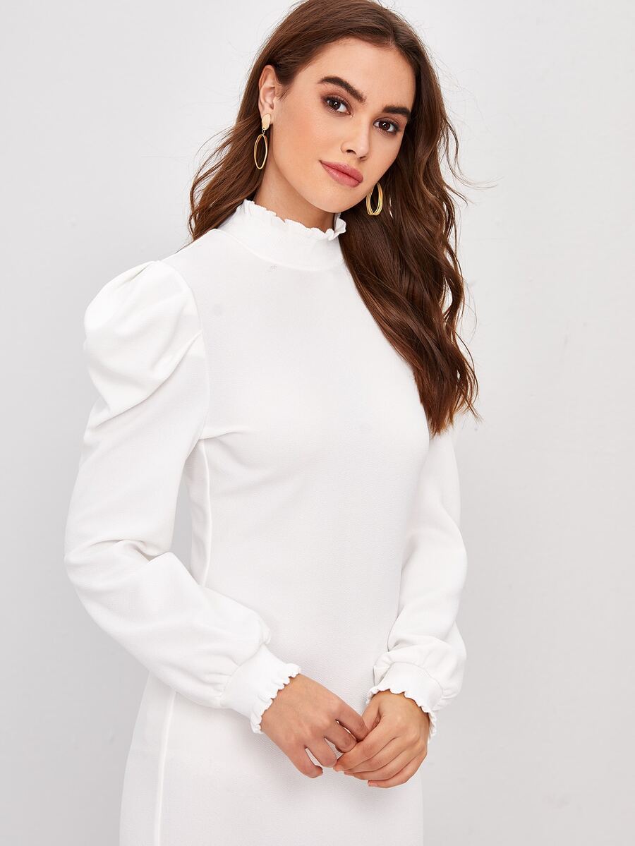 Lettuce Edge Mock-neck Gigot Sleeve Pencil Dress