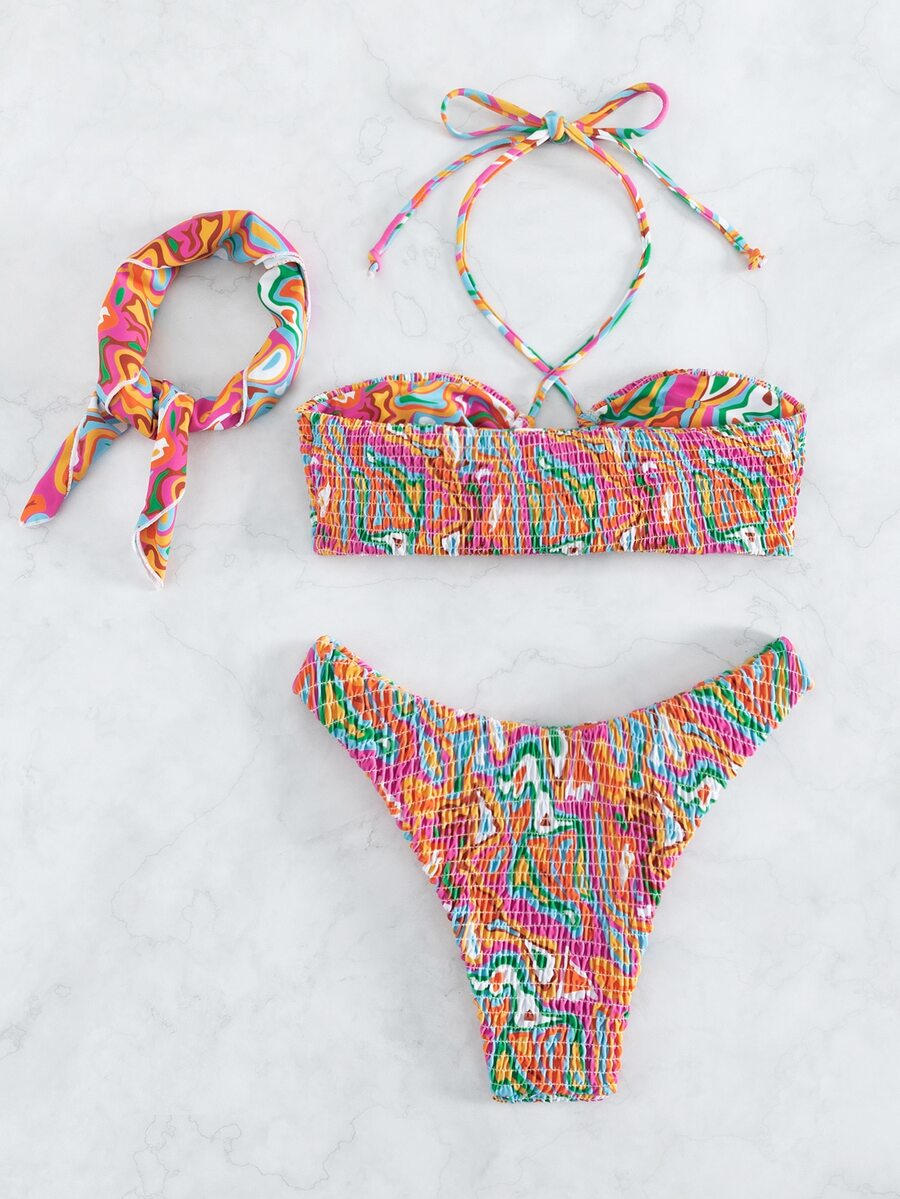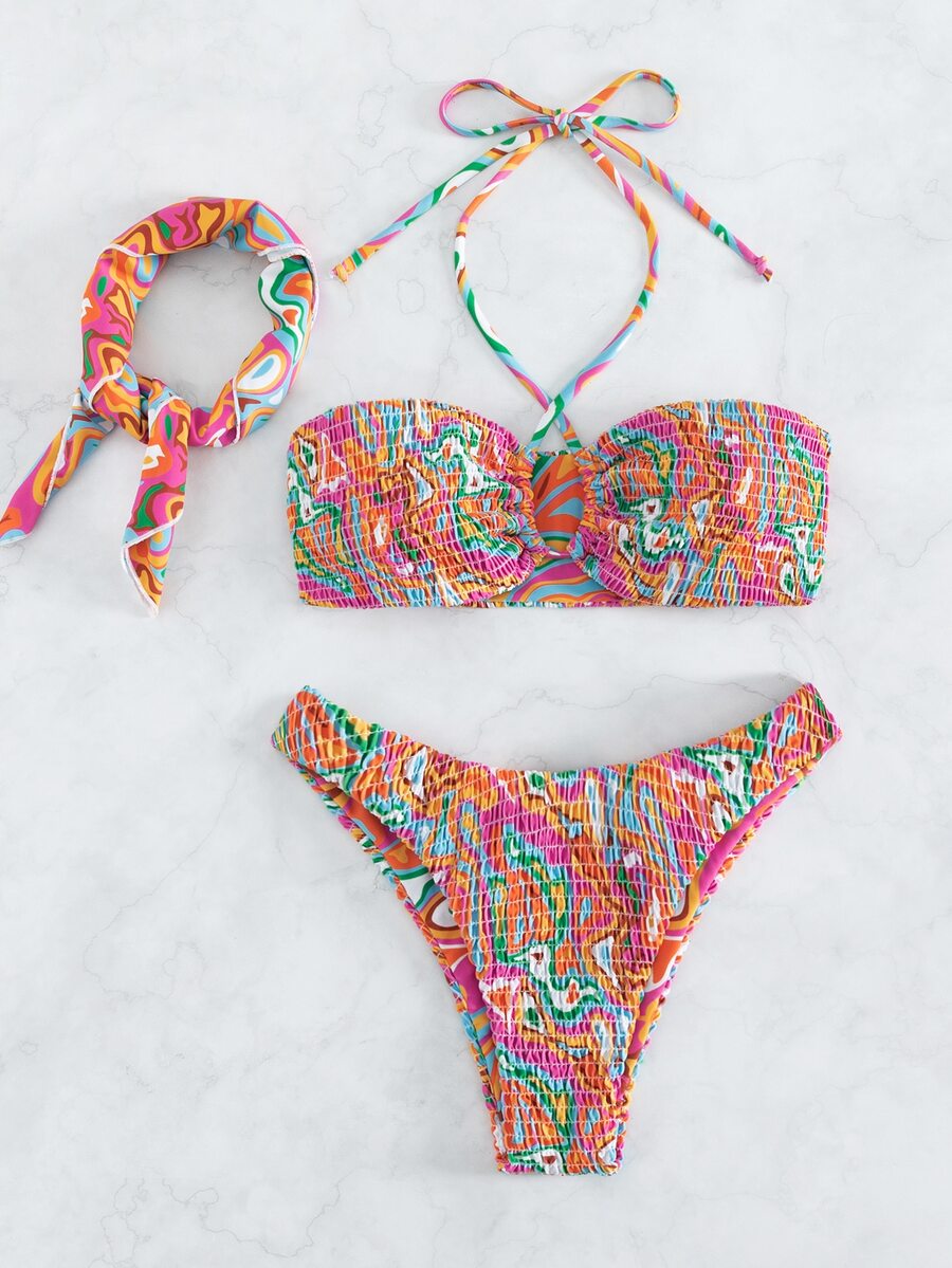 Marble Print Smocked Halter Summer Beach Bikini Set With Bandana