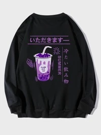 Guys Japanese Letter & Milk Tea Print Sweatshirt