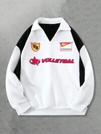 Prep Men's Solid Patchwork V-Neck Letter Print Casual Long Sleeve Sweatshirt